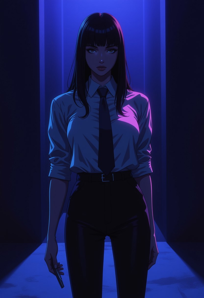 Create an intense, evocative portrait in the Japanese retro anime style of the 80s and 90s. The scene features a feale bathed in deep dark light. The background is stark, with sharp contrasts highlighting the contours of her form. The exclusively blue and purple and black palette intensifies the mood, evoking a setting bathed in neon light. Subtle film grain and meticulous shading add depth and texture, emphasizing the emotional gravity of the scene. The lighting creates a chiaroscuro effect, accentuating her expressive pose and the intense atmosphere. Long, black hair with bangs, and a braid in the back. Full body in frame (standing). Wearing a light dress shirt with dark dress pants, dark dress shoes, and a dark tie. Her face has Mediterranean features, especially her round eyes, aquiline nose, and full lips.