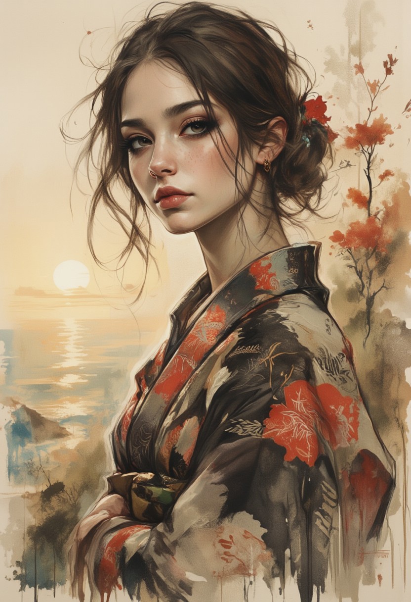 A dinkfsn style ink wash painting, OBxiaoxiang, Inkplash art on rice paper, sepia, henna , Silhouette Art, magnificent, inksplash poster art, closeup portrait of Japanese woman in silk kimono, dark eyeshadow, red lips, standing on cliff overlooking the ocean, sunset, directional lighting