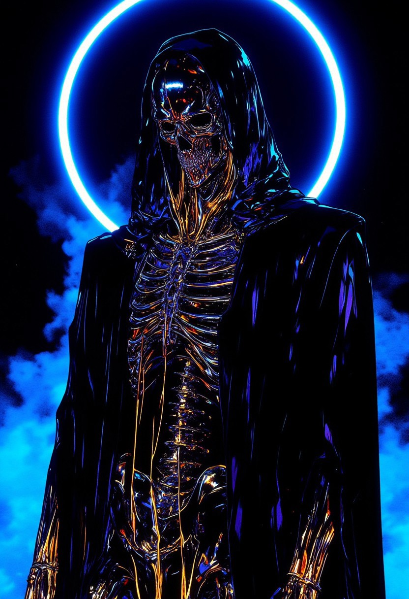 A digital artwork featuring a hyper-stylized depiction of a human skeleton facing forward with its head slightly tilted downward, shrouded in a flowing, tattered robe and a billowing cloak. Its bones are rendered in deep obsidian black with a highly reflective, iridescent sapphire-blue sheen, shifting with hints of violet under the dramatic lighting. A cold cyan glow outlines its form, casting eerie highlights across the metallic surface. Subtle streaks of molten gold pulse along the bone structure, adding an ethereal energy. Intricate line work and precise shading enhance its three-dimensional realism, blending anatomical accuracy with artistic abstraction. Positioned centrally, the skeleton dominates the composition, exuding a haunting, otherworldly presence. Above its head, a radiant, icy white halo flickers with spectral light, creating a stark contrast against the dark skeletal form. The background is a deep, glowing midnight blue with swirling hints of ultraviolet mist, pulsating softly, amplifying the reflective interplay on the skeleton’s surface. The fusion of hyper-glossy black, glowing cyan, and spectral white radiance crafts a futuristic yet ghostly aesthetic. The clean, sharp edges and stylized rendering bring a modern, high-impact visual, while the minimalist approach focuses attention on the luminous skeletal figure. HD, 8K quality, ultra-detailed, masterpiece artwork.