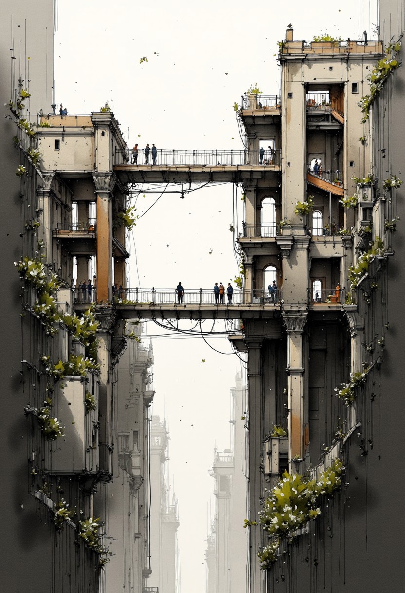The mother of all ancient dilapidated vertiginous bridges, atmospheric view, sketching
