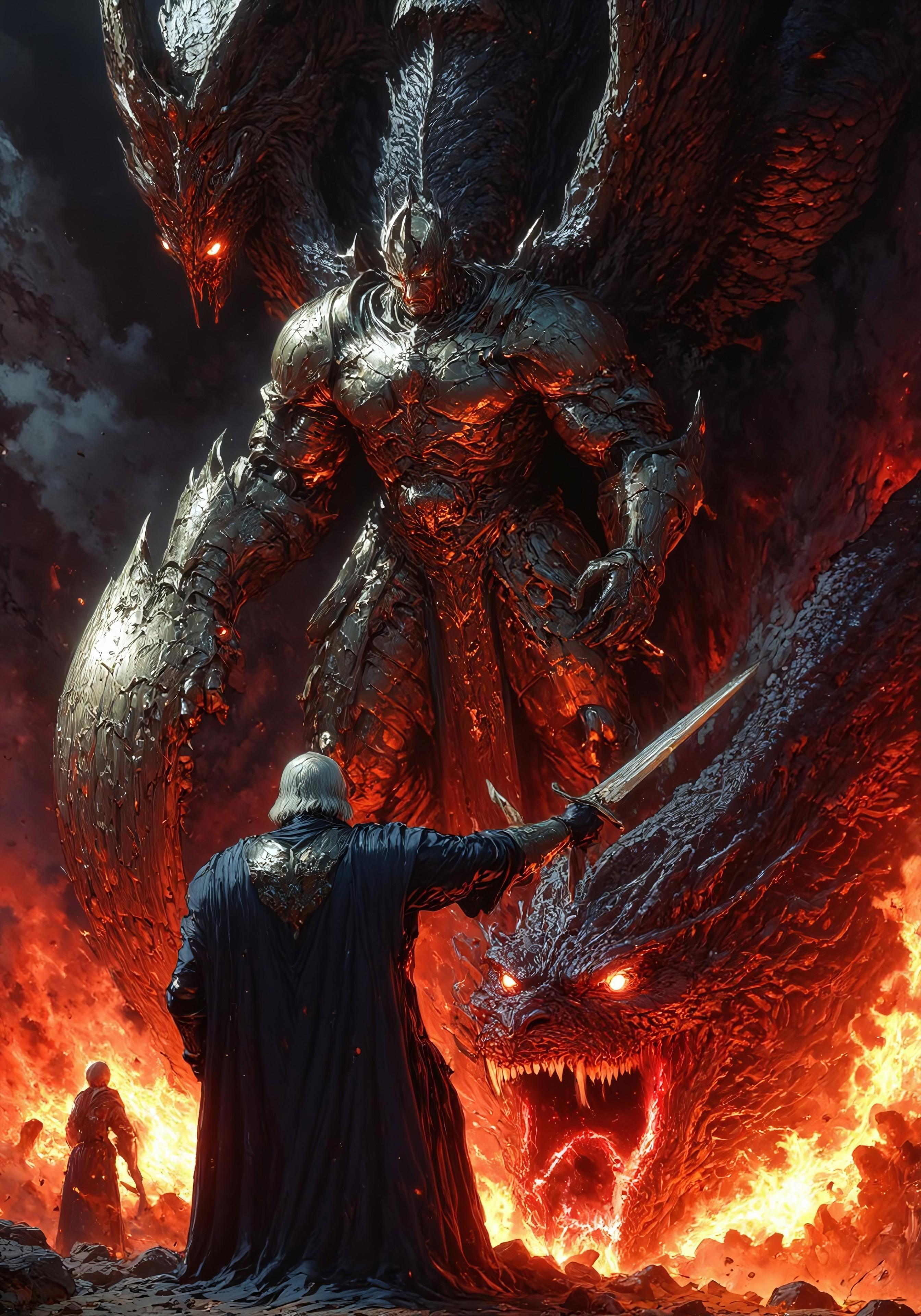 Epic fantasy scene depicting a knight in dark, detailed armor facing a fiery dragon. Powerful, imposing figure of a knight, middle-aged, clad in dark grey, intricate plate armor, holding a sword and shield, positioned to fight. Serious, determined expression, intense focus on the task ahead. The knight's posture conveys a sense of power and readiness for battle. Dragon, large, dark scales with fiery red undertones, flames erupting from its mouth and body, in the midst of a fiery battle. The dragon's expression is fierce, aggressive, and filled with energy. Dramatic fiery orange and reddish-brown colors dominate the scene, contrasting with the knight's dark armor. Fiery environment with a significant amount of intense fire and sparks. The ground is a dark, earthy tone with signs of destruction from the battle. Perspective focuses on the knight and dragon, highlighting their confrontation. The style is illustrative, with intense focus on detailed textures. High contrast lighting accentuates the scene's dynamic drama. The image has a heroic, intense, and dramatic tone.