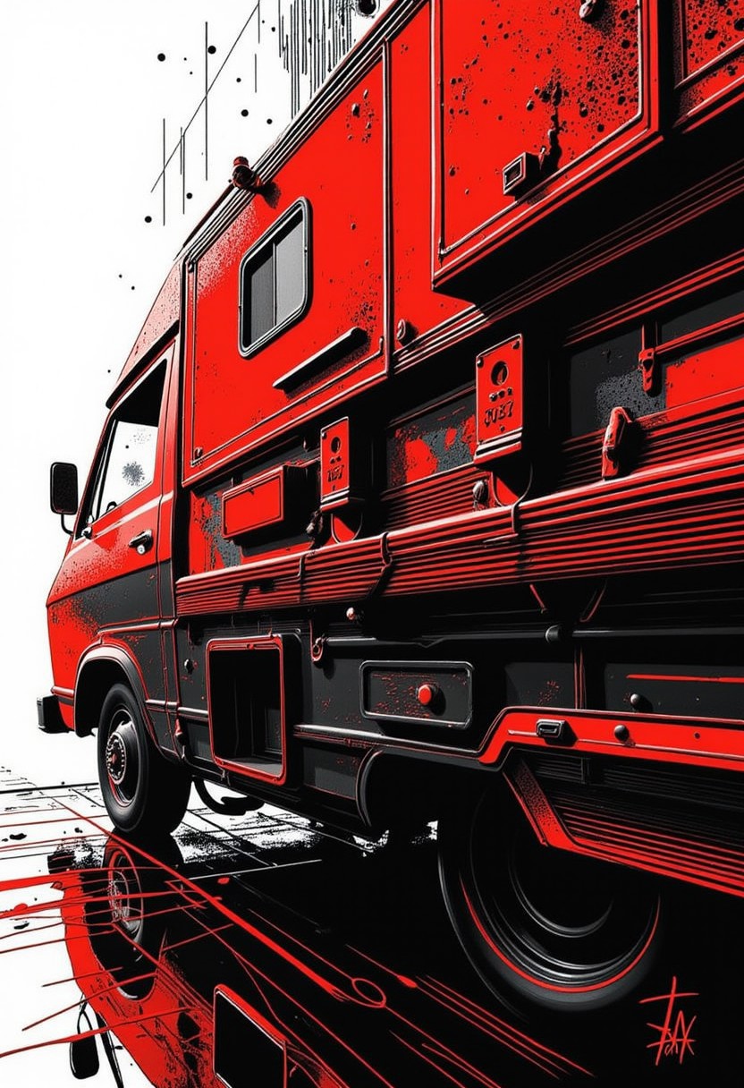 grng style car poster. The camper van's matte metal body is composed of sharp, angular plates with gaps revealing glossy black latex beneath, creating a striking contrast between the rigid metallic exterior and the smooth, flowing latex underneath. The interplay of the exposed latex and layered metal plating adds depth and complexity to the design. The background features abstract digital elements, including fragmented texts, cascading glitch effects, and shifting digital distortion, enhancing the chaotic, futuristic atmosphere. Depth of field emphasizes the camper van’s textures, highlighting the tension between the sharp edges of the metal and the glossy, flexible latex visible in the gaps. grng style, BNR, BNR style, Style of BNR red highlights and outlines, detailed vector illustration