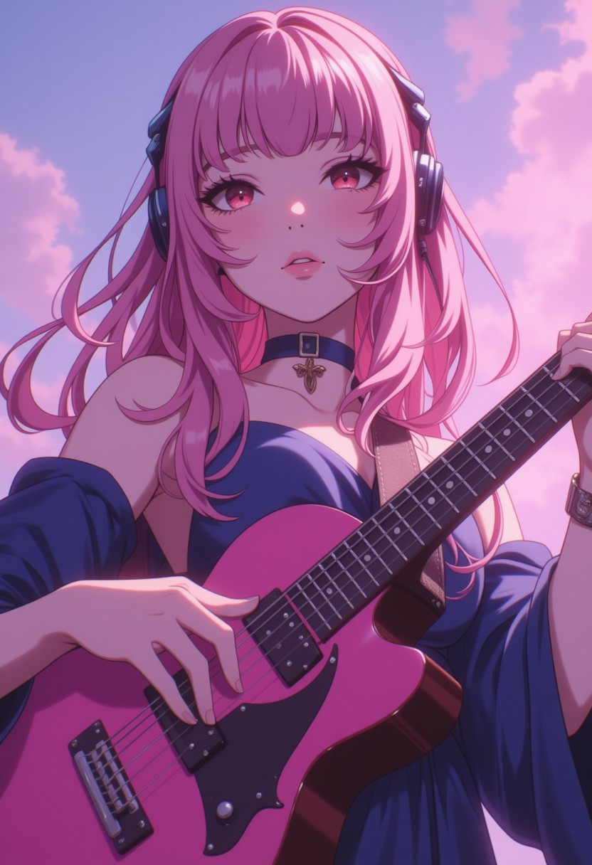 ultra realistic, masterpiece, high detailed skin, best quality, high res, very aesthetic, best quality, good quality, very aesthetic, 8K, 1girl with long pink hair and red eyes, wearing headphones, playing the guitar, music, no lineart, sensitive, masterpiece, best quality, amazing quality, 2d, pastel color, dynamic shot from below, polished chrome
