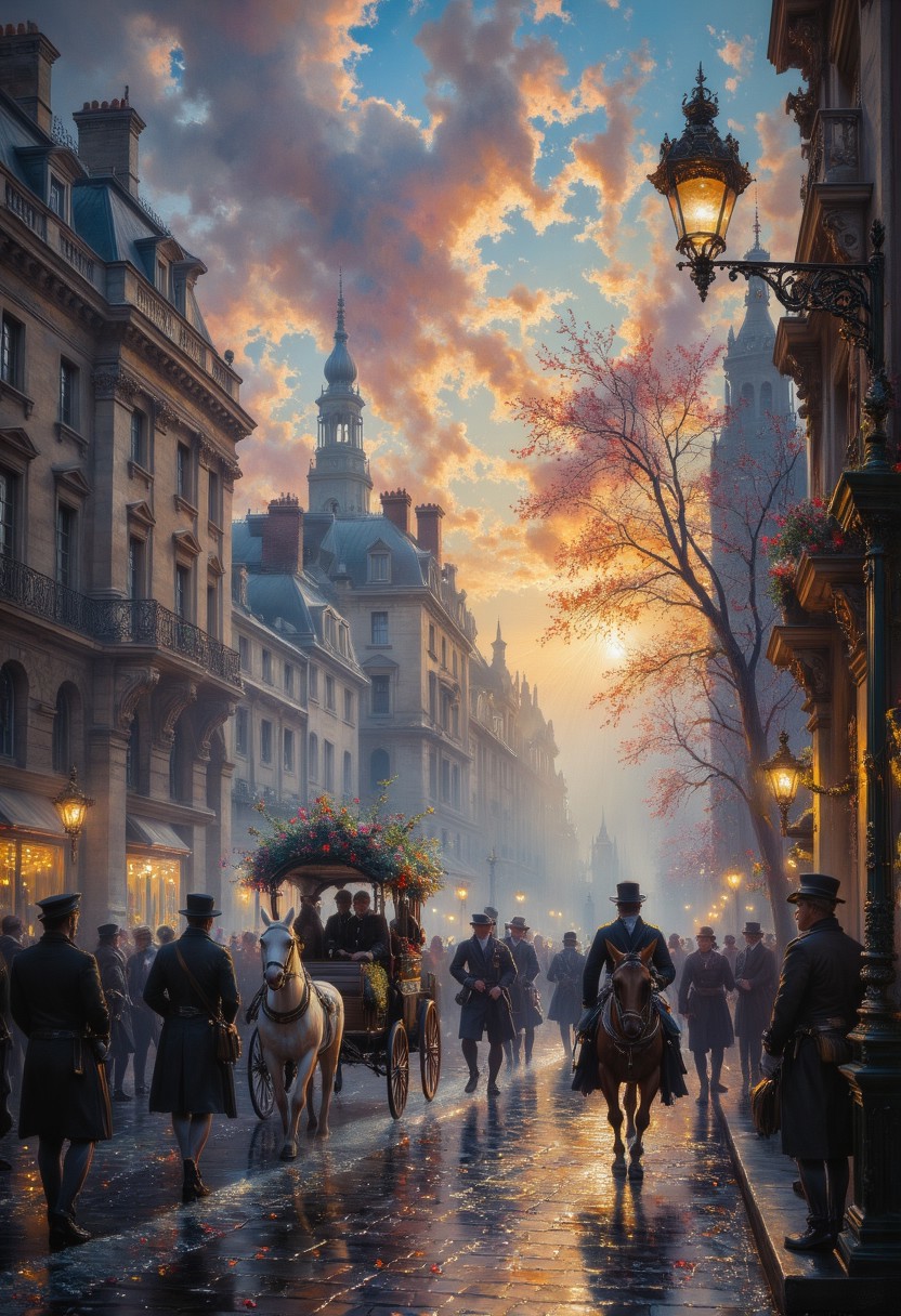 cinematic 1770, 18th century, Paris streets, crowd of people, carriage with horses, fragonard period, late evening, circa 1770, vibring color, style of Andreas Achenbach, monet, oil painting, style of Andreas Achenbach