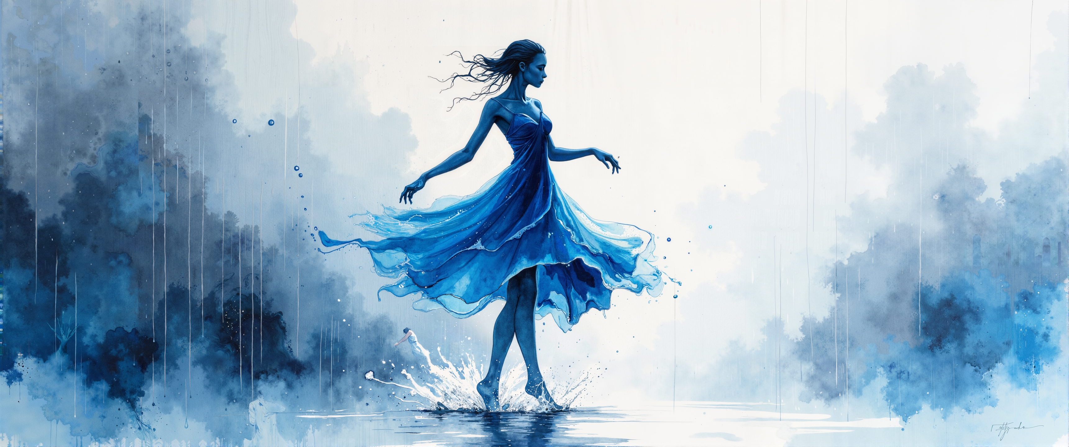 A delicate, semi-abstract watercolor depiction of a figure dancing in rain, with fluid, transparent layers of indigo, cerulean and slate blue merging seamlessly. Each droplet rendered with loose, wet-on-wet technique creating luminous, bleeding edges that dissolve into the textured cold-press paper. Soft splashes radiate outward, their translucent quality capturing the ephemeral nature of movement and water. The dancer's form suggests rather than defines, with deliberate pigment blooms and controlled diffusion creating a sense of motion. White spaces of untouched paper provide highlights, enhancing the composition's airy lightness. Subtle salt-speckled textures create crystalline effects among the flowing washes. Background gradients transition from deep ultramarine to misty gray, with intentional backruns creating organic patterns. Elegant, minimal brushstrokes suggest the essential form while maintaining watercolor's characteristic luminosity and atmospheric perspective. <lora:flux_semifluid_pigments:0.2> <lora:é»è²å¹»æ³_1.0:0.3> <lora:RM_Animefy_v1.0M:0.5> <lora:flux_dev:1>