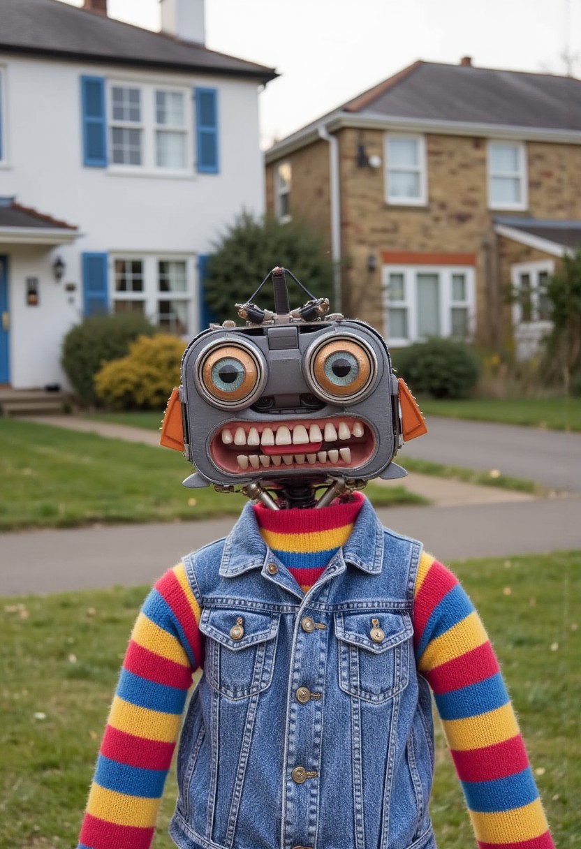 fugglers, Johnny5 robot with a big smile, in a suburban family home