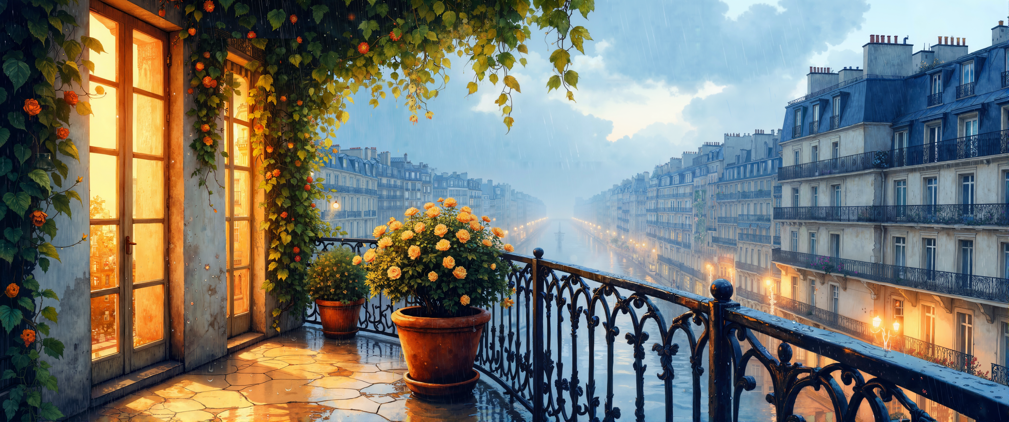 A delicate watercolor rendering of a rain-soaked Parisian balcony at dusk, where wrought iron railings meet cascading flowering vines. Soft-edged raindrops cling to petals and leaves, creating translucent jewel-like effects. The wash technique captures the glistening wetness on surfaces, with pigments bleeding subtly at boundaries. Warm amber light spills from interior windows, creating luminous reflections in small puddles. Background buildings dissolve into atmospheric perspective with feathered edges and controlled diffusion. The paper's texture shows through in highlight areas, enhancing the characteristic granulation of ultramarine and sienna pigments. Wet-on-wet technique creates dreamy color transitions between the indigo sky and golden building facades. Masterful glazing layers build depth while maintaining watercolor's signature transparency. Delicate white space preserves the paper's luminosity around key elements. <lora:ck-shadow-circuit-000021:0.4> <lora:style_of_Norman_Ackroyd_FLUX_100:0.2> <lora:flux_dev:1>