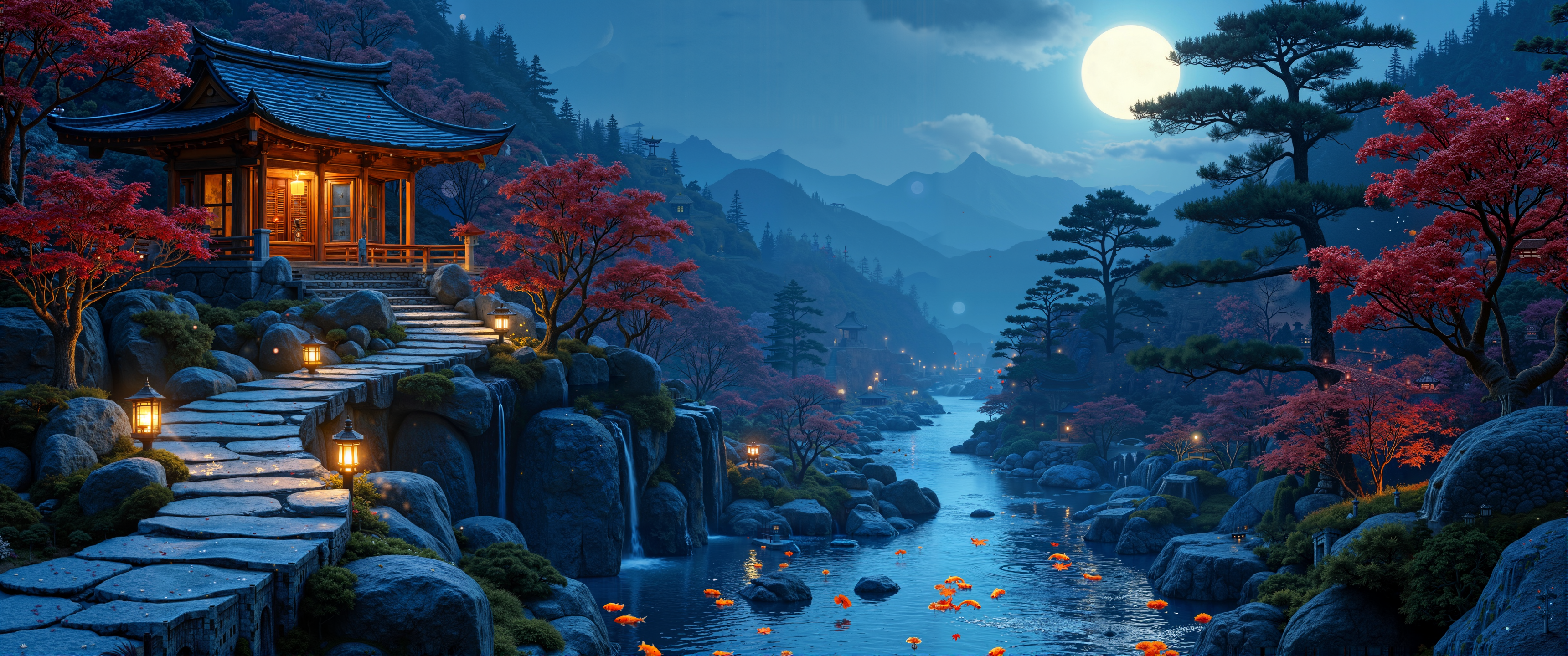 Ethereal moonlight bathes an ancient Japanese mountain garden, illuminating cascading terraces with silver-blue glow. Stone lanterns with intricate carved designs line winding pathways of weathered granite stepping stones. A weathered wooden pavilion overlooks a series of small waterfalls tumbling between moss-covered boulders. Crimson maple leaves scatter across still reflecting pools where golden koi fish shimmer beneath floating lotus blossoms. Meticulously pruned black pine trees cast elegant shadows across raked white gravel patterns suggesting flowing water. Distant mountain silhouettes fade into midnight-blue mist. Executed in nihonga style with mineral pigments on traditional washi paper, featuring delicate brushwork and gold leaf accents. Masterful composition balancing yÅ«gen mystery with intimate details, capturing mono no aware â beauty's impermanence. Rich indigo and vermilion against earthen tones, extraordinary detail in textures of wood, stone, and foliage. <lora:Synesthesia:0.2> <lora:Ganin_II:0.1> <lora:flux_dev:1>