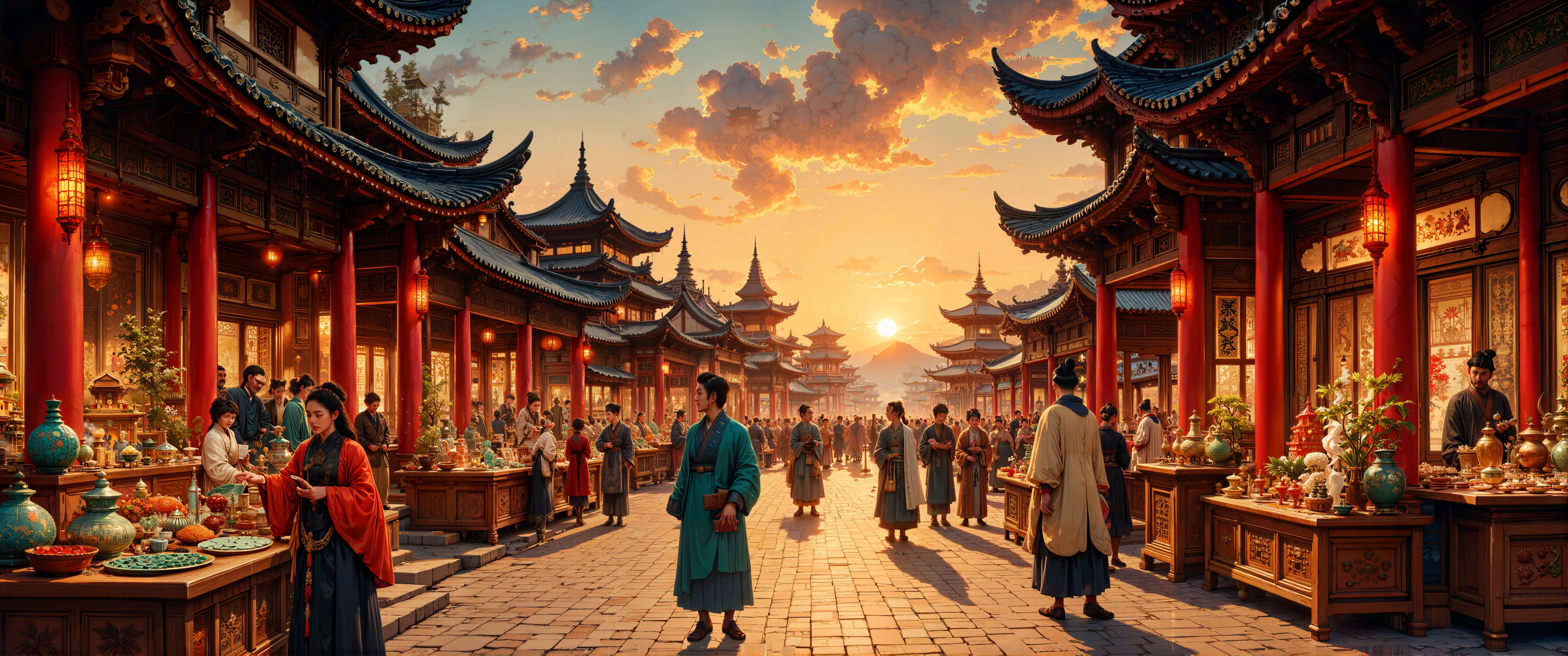 Ancient Silk Road marketplace at dusk, rendered in meticulous gongbi style with fine line work and vibrant mineral pigments on traditional rice paper. Elegant Tang Dynasty architecture with upturned eaves and vermilion columns frames the bustling scene. Merchants in historically accurate attire display precious jade carvings, lustrous silks, and burnished bronze vessels. Incense smoke curls upward, creating misty atmospheric perspective. Background features distant caravanserai silhouetted against amber sunset clouds. Foreground details include scholars examining scrolls, ceramic tea merchants, and spice traders with saffron and cinnamon. Compositional balance follows classical Chinese principles with asymmetrical harmony and strategic negative space. Subtle gold leaf accents highlight architectural details and precious goods. Every brush stroke conveys the prosperity and cultural exchange of the great Tang commercial golden age. <lora:FluxMythG0thicL1nes:0.8> <lora:MushyFunk:0.3> <lora:flux_dev:1>
