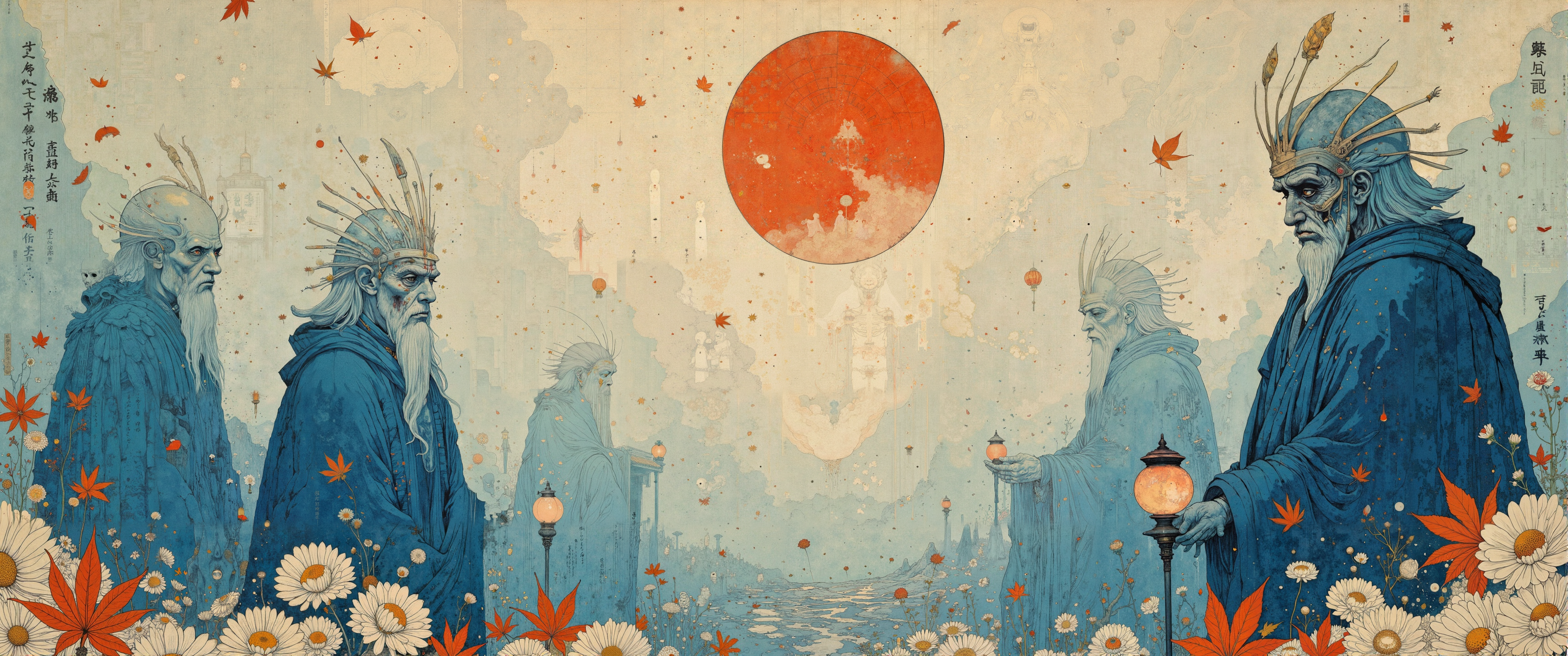 Nihonga masterpiece depicting warriors' souls in azure limbo, floating lanterns guide pathways between realms. Ancestral samurai armor fragments suspended in misty expanse, ethereal mineral pigment application on washi paper creates translucent layers. Chrysanthemum petals and maple leaves scatter through composition, representing honor and transience. Indigo and vermilion accents against muted gray backdrop, echoing concepts of mujo (impermanence) and rinne (cycle of rebirth). Traditional tarashikomi technique creates pooling effects resembling ghostly auras. Delicate gold leaf application illuminates sacred artifacts. Asymmetrical composition with intentional empty space (ma) drawing viewer into spiritual narrative. Bold sumi-e brushstrokes define spectral figures, their features blending between human and yokai forms. Faint calligraphy in ancient script borders the scene, containing prayers for peaceful passage between worlds. <lora:DND_GRAINYBOYZ_FG_FLUX_V2_ROMULUS_Lora:0.7> <lora:openart_Surreal_Anime_III_20250104_025344:0.3> <lora:Illustration concept V1:0.5> <lora:flux_dev:1>