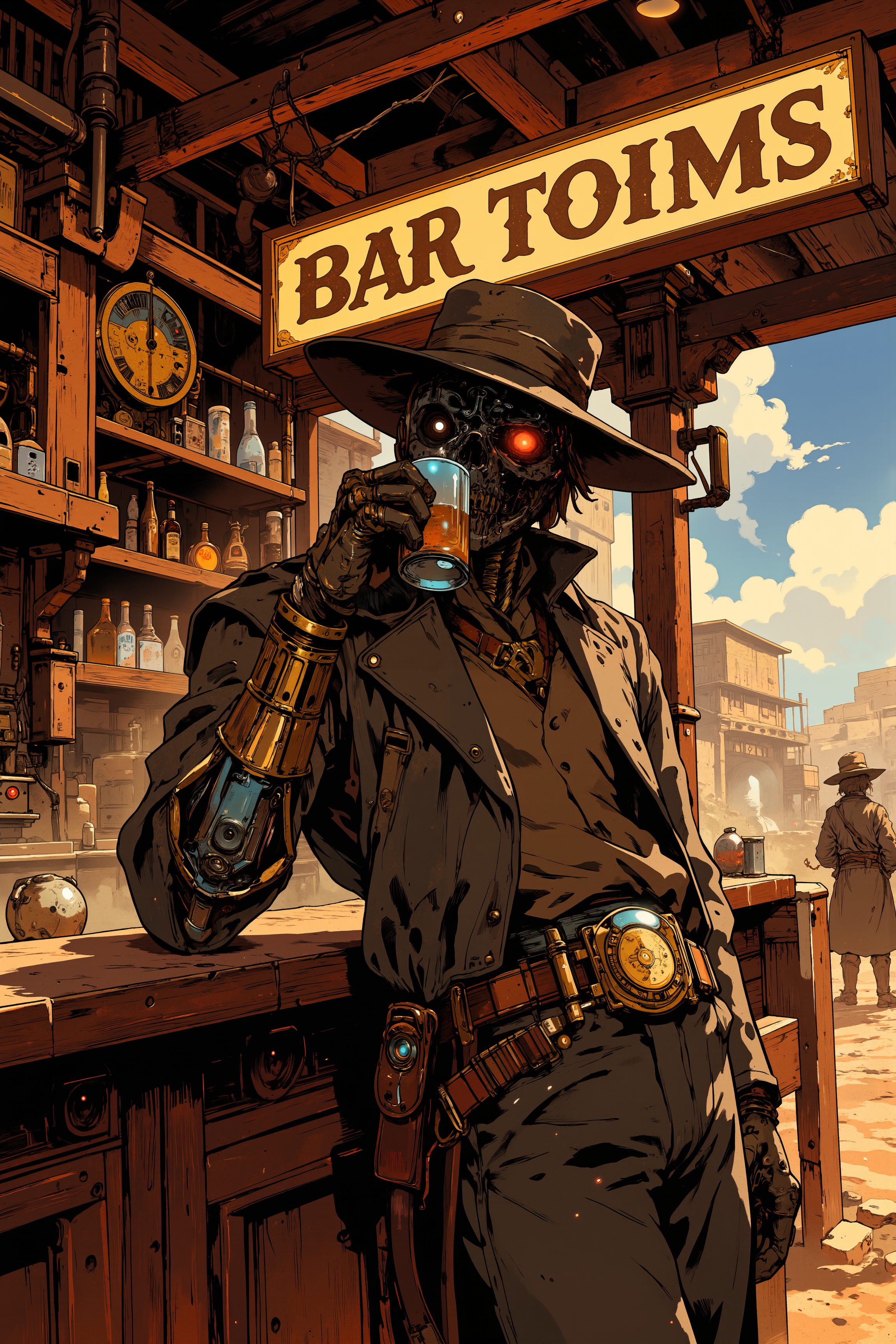 At the end of a long, winding desert road, a dusty saloon built from riveted steel and weathered wood sits beneath the scorching midday sun, its large brass sign glinting in the light. Leaning against the bar inside, a rugged gunslinger with a mechanical arm and glowing, crimson eyes sips from a glass of whiskey, his wide-brimmed hat pulled low over his face. The saloon is filled with the sounds of ticking gears and the soft hum of a steam-powered piano, its keys moving on their own as it plays a slow, haunting melody. Behind the bar, an automaton bartender polishes brass mugs with mechanical precision, its glowing blue eyes flickering as it watches the patrons. The gunslingerâs coat is frayed at the edges, and his twin revolvers, each adorned with intricate clockwork designs, rest on his hips, their barrels glowing faintly with untapped energy. Around the room, a mix of humans and clockwork cowboys sit at the metal tables, playing cards or exchanging stories of distant steam-powered cities. The air is thick with the scent of oil and whiskey, and the faint hiss of steam can be heard from the pipes that run along the ceiling. Outside, the distant whistle of a steam train echoes through the town, a reminder that the Wild West is ever-evolving in this age of gears and steam.<lora:Anime v1.3:0.4><lora:XRSTYLE_FLUX:0.5><lora:RetroAnimeFluxV1:0.5><lora:Let_It_Blaze_in_Crimson_anime_v1.0:0.4><lora:MJanime_Flux_LoRa_v3_Final:0.4>