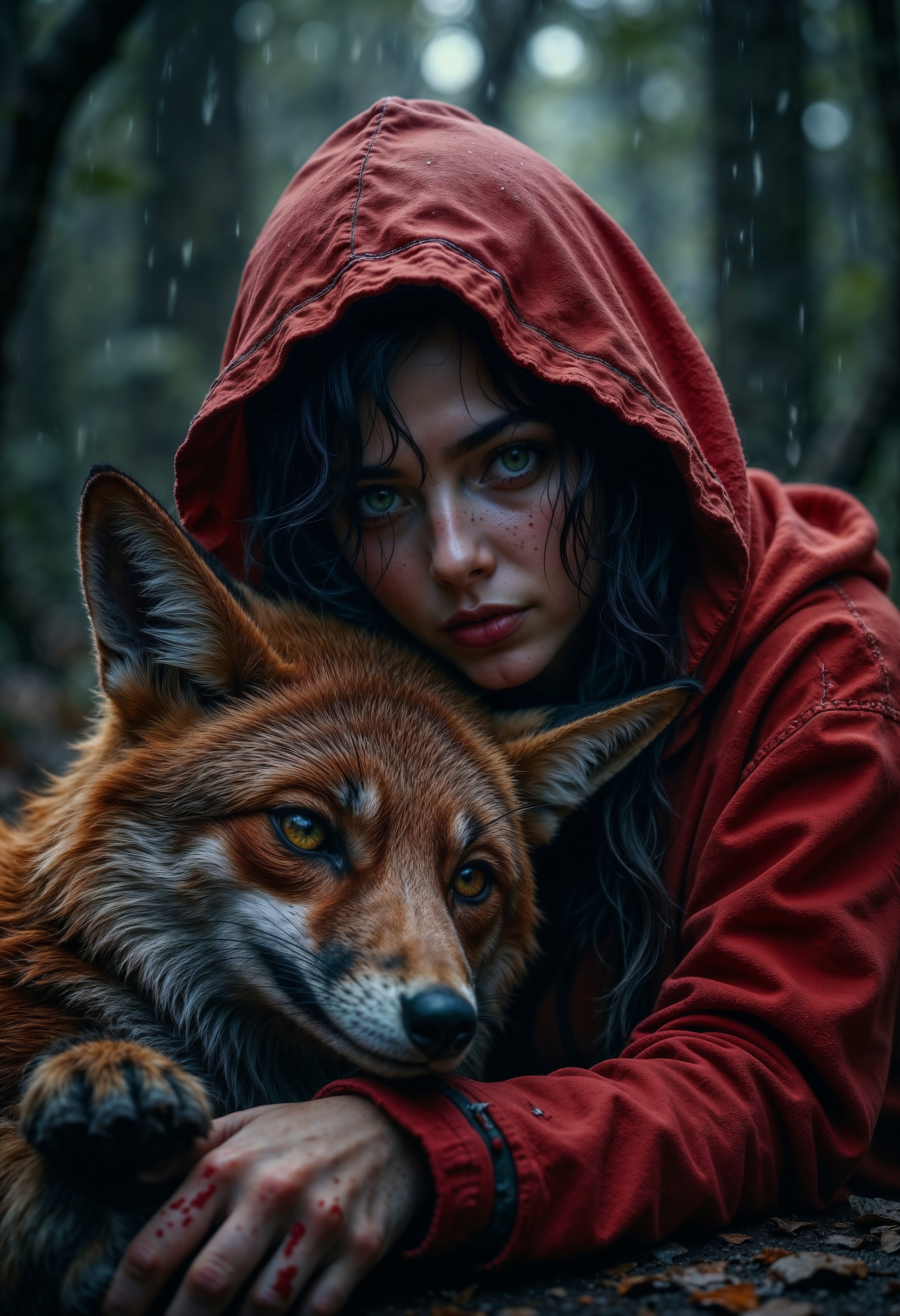 Highly detailed and dramatic digital artwork featuring a young woman with striking green eyes and fair skin, wearing a vibrant red hooded cloak. Her dark hair is slightly wet, suggesting a rainy or misty environment. She is closely embracing a large, realistic fox with a thick, textured fur coat. The fox's eyes are piercing and its fur is intricately detailed, with a natural red and dark pattern. The woman's hand, with red-stained fingers, rests gently on the fox's head, adding a sense of unity and connection between them. The background is a dark, dense forest, enhancing the mysterious and enchanting atmosphere of the scene. The overall composition is rich in color and texture, emphasizing the bond between the woman and the fox. <lora:FluxMythR3alisticF:1>