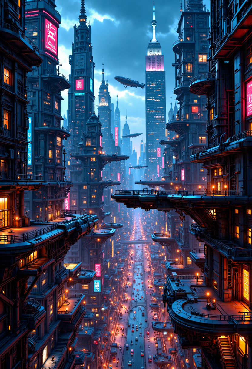 Create a highly detailed,high-resolution image of a futuristic cyberpunk city with towering neon-lit skyscrapers stretching into the dark night sky. Amidst this bustling metropolis,depict various airships and flying vessels navigating through different levels of the cityscape - some soaring above the tallest spires while others dock or hover near sleek rooftop landing pads. Incorporate vibrant,pulsing lights reflecting off gleaming metallic surfaces to immerse the viewer in a captivating vision of what urban life might look like in a futuristic world blending technology and fantasy.,<lora:FluxMythP0rtr4itStyle:1>,mythp0rt,<lora:Flux_Detailer_v3:0.8>,Jeddtlv3,
