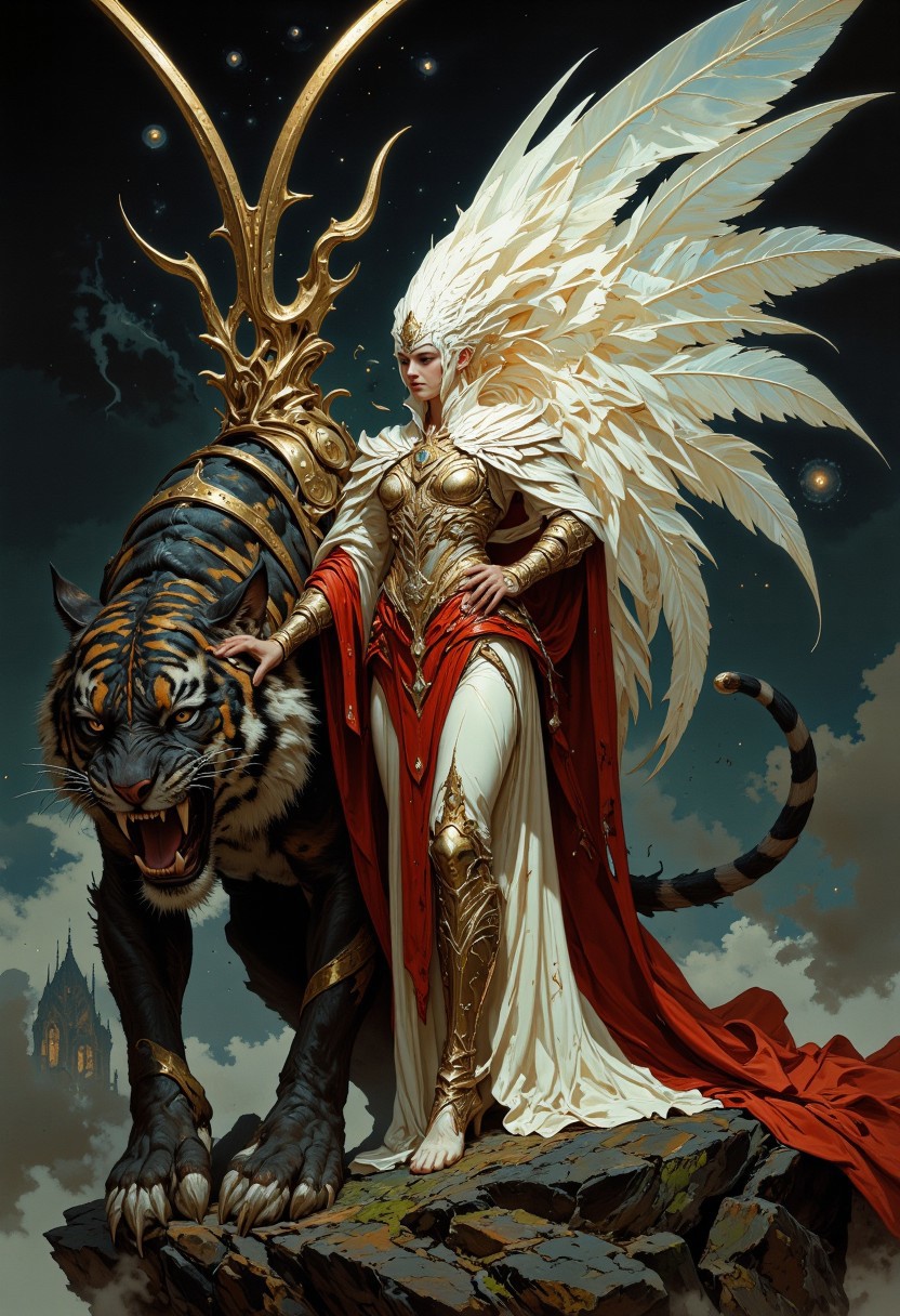 score_9, score_8_up, score_7_up, 8k high quality digital painting, masterpiece, very detailed, ultra realistic, (best quality) very detailed epic masterpiece, boris vallejo style, frank frazetta style, realistic oil painting, retro artstyle, full body, we see an unearthly beautiful goddess with feather wings and a red and gold outfit, she stands in a glass world, next to her stands a black tiger with golden stripes, the tiger has turned its head to the side and is roaring, big teeth, full body, breathtaking landscape in the background, detailed oil painting style Rembrandt style, Vermeer style, Dungeons and dragons atmosphere, heroic fantasy, realistic, realism, full