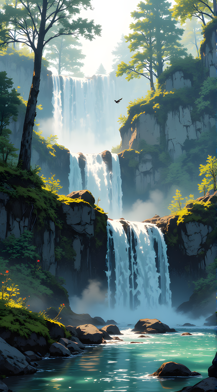 The scene unfolds as a serene, ethereal woodland paradise, where the gentle hum of nature fills the air with a sense of quiet magic. At its heart lies a cascading waterfall, its waters tumbling gracefully down a series of moss-covered ledges and into a tranquil pool below. The sunlight filters through the dense canopy of towering trees, casting dappled patterns of light and shadow across the landscape, creating an atmosphere that feels both ancient and timeless. The waterfall itself is a marvel of natural beauty. Its upper tiers cascade in delicate streams, their white froth contrasting sharply against the dark, rugged rocks that form the cliffs. As the water plunges further, it gathers momentum, forming a shimmering veil that catches the light like a thousand tiny diamonds. The final descent culminates in a broad, emerald-green pool, its surface calm and reflective, mirroring the sky above and the lush foliage that surrounds it. The surrounding forest is alive with vibrant hues. Trees of varying heights and species stand sentinel, their leaves a mix of deep greens and hints of golden-yellow, suggesting the transition between seasons. Moss carpets the ground and clings to the rocks, adding layers of texture and depth to the scene. Here and there, patches of wildflowers peek out from the undergrowth, their delicate petals catching the light and lending a touch of whimsy to the otherwise solemn setting. In the distance, the mist hangs low, obscuring parts of the landscape and lending an air of mystery to the far reaches of the forest. The light seems to dance on the edges of this fog, creating a soft glow that enhances the dreamlike quality of the scene. Birdsong can almost be heard, though silent, their presence implied by the gentle rustling of leaves and the occasional flutter of unseen wings. The overall mood is one of profound peace and wonder. It is a place untouched by time, where the elementsâwater, earth, and airâexist in perfect harmony. Every detail, from the smooth flow of the waterfall to the intricate textures of the moss and bark, speaks to the raw beauty of nature. This is not merely a landscape; it is a sanctuaryâa hidden corner of the world where one might lose themselves in the embrace of creation. j_art, anime, anime art, <lora:FLUX\jul\J_Anime:0.7>, <lora:FLUX\RealAnime:0.7>