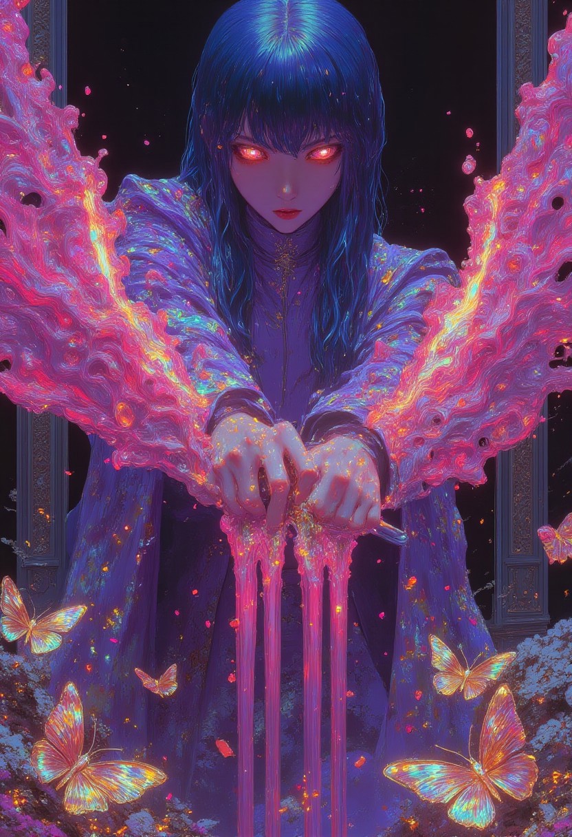 A stunning manhwa portrait inspired by Piet Mondrian’s bold modernism and Tamara de Lempicka’s refined elegance. An eerie girl with long, electric-blue bangs and an intense, vacant expression, her half-closed eyes glowing neon yellow, devoid of pupils, locking hauntingly onto the viewer. She wears a vibrant cyan Japanese school uniform beneath an oversized ultraviolet overcoat, the heavy fabric shifting as she draws a katana in a frozen moment. The blade releases sharp arcs of luminescent magenta splashes, thick and heavy, vivid pink at its core, fading into an iridescent violet at the edges. Small droplets scatter chaotically, enhancing the surreal yet hyper-realistic motion. Captured from a high-angle perspective, she appears both diminutive and overwhelmingly ominous. The background blends crisp architectural elements with painterly textures, merging Mondrian’s modern abstraction with Lempicka’s luxury. The lower portion features stylized metallic butterflies in reflective gold and electric teal, adding a surreal yet polished touch. The neon-dominated palette amplifies the eerie intensity, heightening the fusion of horror and dark fantasy.