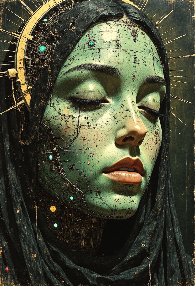 Close-up portrait of a stylized android woman inspired by Renaissance painting. Only her face and part of her upper shoulders are visible. Her skin resembles a mottled green printed circuit board—textured with etched metallic patterns, microchips, and fine embedded transistors. Faint lines of illuminated circuitry run beneath the surface, glowing softly in green and cyan hues. Her expression is serene and contemplative. Eyes gently closed. Lips slightly parted. Her facial structure is symmetrical and feminine, with soft cheekbones, a high nose bridge, and sculpted jawline. Areas of her face—beneath one eye, along her temple—are opened to reveal layered components and silver neural wiring, nestled in synthetic tissue. She wears heavy, Renaissance-style makeup: dark lashes, deep shadow across her eyelids, subtle gold dust on her cheeks. Her head is framed by a nimbus halo—thin, circular, hovering above the crown, lined with cracked wiring and multicolored LEDs, some flickering faintly. The halo is worn, chipped, patched with soldered wires and hanging threads of fiber optics. Her hair is minimal—black, synthetic filaments braided tightly back or entirely absent. A high-necked fabric collar in aged brocade is just barely visible at the bottom of the frame. Soft Rembrandt lighting illuminates the left side of her face. Background is dark with faded fresco texture. High detail. Shallow depth of field. Sacred. Still. Cybernetic grace.