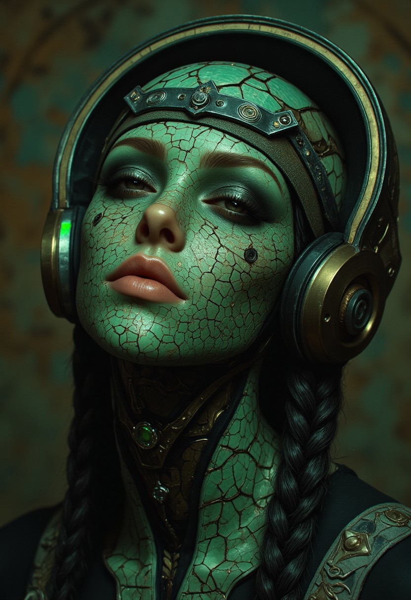 Close-up portrait of a stylized android woman inspired by Renaissance painting. Only her face and part of her upper shoulders are visible. Her skin resembles a mottled green printed circuit board—textured with etched metallic patterns, microchips, and fine embedded transistors. Faint lines of illuminated circuitry run beneath the surface, glowing softly in green and cyan hues. Her expression is serene and contemplative. Eyes gently closed. Lips slightly parted. Her facial structure is symmetrical and feminine, with soft cheekbones, a high nose bridge, and sculpted jawline. Areas of her face—beneath one eye, along her temple—are opened to reveal layered components and silver neural wiring, nestled in synthetic tissue. She wears heavy, Renaissance-style makeup: dark lashes, deep shadow across her eyelids, subtle gold dust on her cheeks. Her head is framed by a nimbus halo—thin, circular, hovering above the crown, lined with cracked wiring and multicolored LEDs, some flickering faintly. The halo is worn, chipped, patched with soldered wires and hanging threads of fiber optics. Her hair is minimal—black, synthetic filaments braided tightly back or entirely absent. A high-necked fabric collar in aged brocade is just barely visible at the bottom of the frame. Soft Rembrandt lighting illuminates the left side of her face. Background is dark with faded fresco texture. High detail. Shallow depth of field. Sacred. Still. Cybernetic grace.
