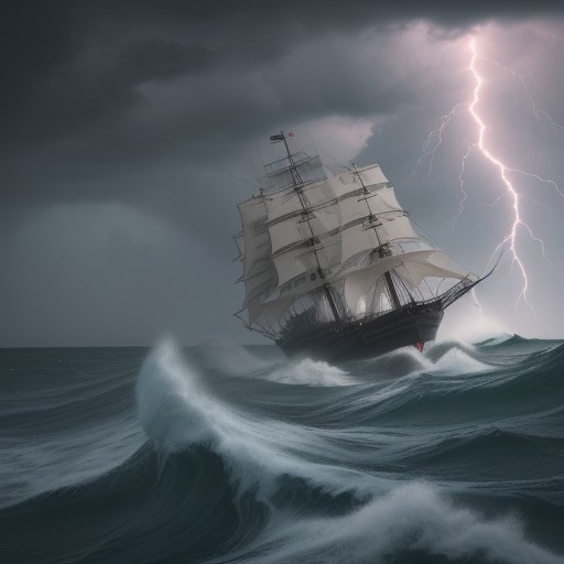 Massive dark clouds roll over a turbulent ocean as lightning crackles in the distance. A lone ship battles against towering waves, its sails shredded by the wind.