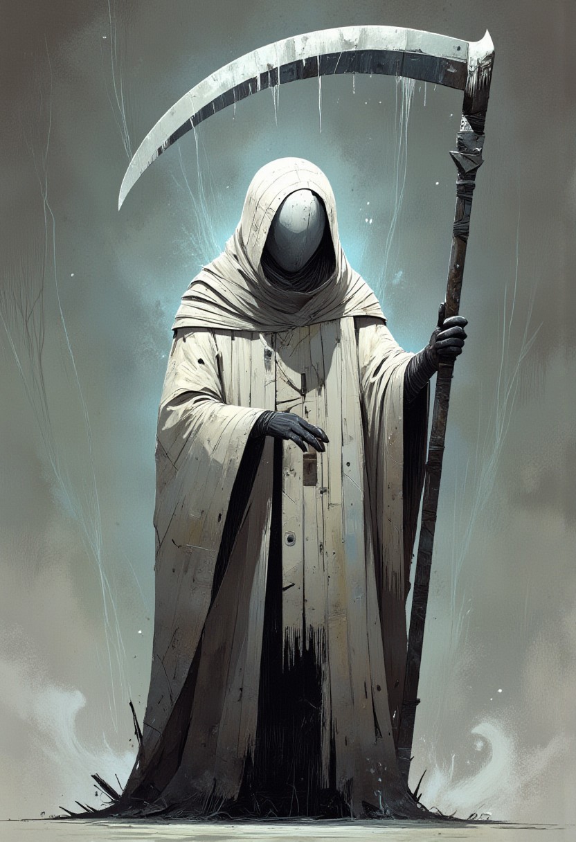 A priestess of entropy, her ashen robes constantly disintegrating and reforming, her face obscured by a mask of melted silver. Her Scythe, "Void’s Whisper," siphons the essence of reality itself, unraveling existence with each cut. Where she walks, time slows, the world turns to grayscale, and even the gods dare not look into her empty, endless eyes. , ppstorybook, aidmamj6.1