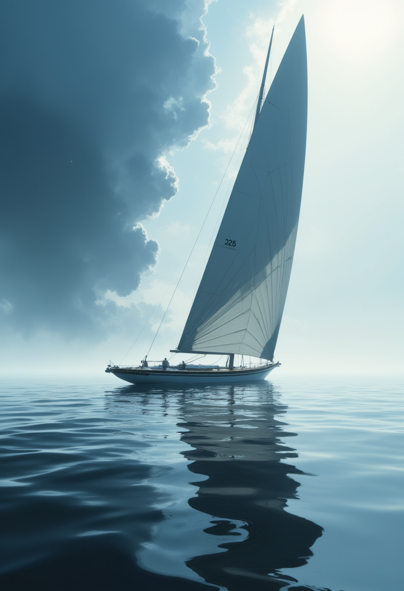 From the side, in profile, you can see a majestic sailboat with a regular keel. The design is divided into two parts by the waterline. Above the water, we see an elegant modern sailboat in the minimalist style, the design of which is reminiscent of the Renaissance style of the early 20th century. The elegant sails are decorated in a simple style, with the number 3275 printed on them in small black letters. Cumulus clouds rise into the stratosphere well above the sails, rising from the misty blue sky at water level. We see a huge killer whale underwater. Overall, the focus is on the sailboat, which is bright and elegant, with an artful marine design. The details are barely noticeable and not immediately noticeable if you don't look closely. . An otherworldly atmosphere. Epic.. The overall composition feels cinematic, blending high fashion with a science fiction aesthetic. . . (Depth of field), low saturation,detail. ,,. ,,. masterpiece, best quality, medium-format camera, high-contrast, dramatic lighting, striking composition, . (Depth of field), low saturation,detail. mythp0rt, charismatic., ,,. masterpiece, best quality, dramatic lighting,. An otherworldly atmosphere. (Depth of field), low saturation,detail. mythp0rt Stylish, charismatic.PA ,,sNOW wHITE, (Depth of field), low saturation,detail. mythp0rt Stylish, charismatic., belle (Depth of field), low saturation,detail. mythp0rt Stylish, charismatic. ,. , low saturation,detail. mythp0rt Stylish, charismatic. ,,aidmamj6.1,ne0nfant4sy, The background is minimalist, a gradient of shadowy blue tones, amplifying the ethereal and futuristic ambiance of the scene. . Thin border of tiny maple leaves that glitch and fade around the edges overlaid on a black border background... with rays of sunlight piercing through the misty atmosphere. masterpiece. An otherworldly atmosphere, Mysticism. mythp0rt, (Depth of field),detail. mythp0rt, Stylish, charismatic. , Otherworldly atmosphere. aidmamj6.1 (Depth of field), low saturation,detail. mythp0rt Stylish, charismatic.c. (Depth of field),,detail. mythp0rt Stylish, charismatic. ,aidmamj6.1,ne0nfant4sy,. <lora:domiswaunfluxmini:1>