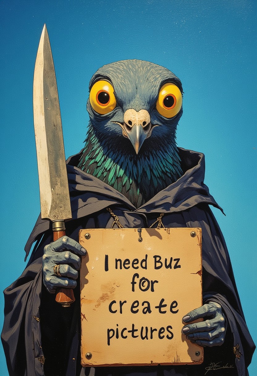 masterpiece, best quality, create a detailed oil painting in a dark fantasy style featuring a pigeon with oversized, bulging yellow eyes, staring intently at the viewer while holding a comically large knife and holds a sign in his that says "I need Buzz for create pictures.". Incorporate noticeable pencil strokes to add texture to the artwork. The background should be a simple sky blue, providing a contrasting backdrop to the whimsical yet intriguing scene. The artwork should be inspired by the Renaissance, showcasing realism and the qualities of portrait photography. Focus on creating a captivating and imaginative portrayal of this unique character, Cinematic, beautiful, vibrant, masterpiece, 32k, ultra HD, ultra-detailed, amazing quality, amazing artist, sharp edges, detailed textures, full view, atmospheric lighting, amazing visuals