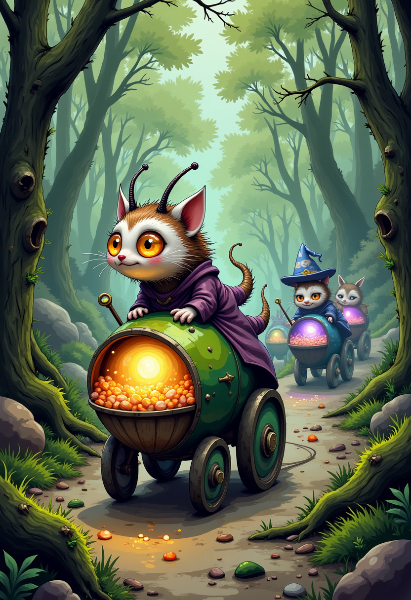 WackSplashDaal A caravan of walking teacup-snail hybrids pulling tiny moss-covered wagons filled with glowing dream fragments; a curious hedgehog wizard with galaxy eyes leads them with a wand carved from moon-bone; rich forest greens, soft oranges and purples, like a magical nature documentary directed by Guillermo del Toro.