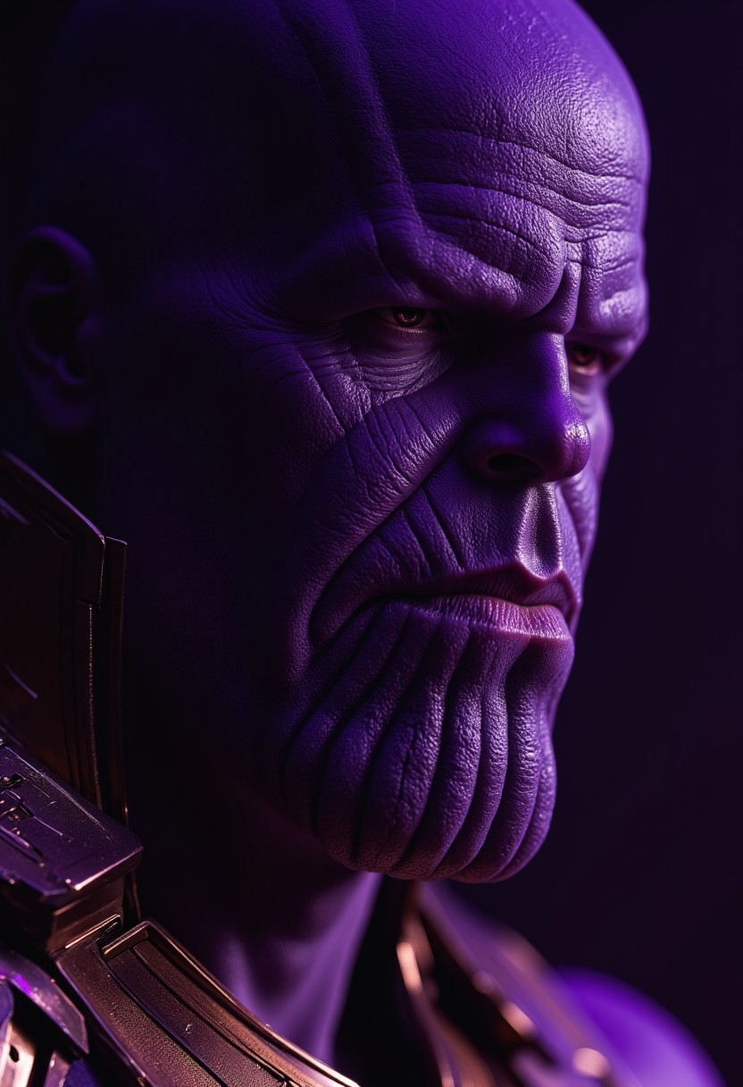 Dramatic profile portrait of Thanos, mature male character. Deeply wrinkled, aged skin with strong jawline. Dark, brooding expression, conveying intense emotion and power. Light-purple, violet, and crimson tones illuminate his features, highlighting texture and depth. High-contrast lighting creates a dramatic effect, emphasizing the character's form and silhouette. Medium-shot profile, showcasing upper body and head. Detailed depiction of the character's highly textured, rugged skin and intricate details, including fine lines around the eyes and mouth. Dark, bold color palette conveys a sense of darkness and evil. Costume elements: Dark violet and crimson armor, showcasing intricate details and texture. High definition, photorealistic style focusing on realistic skin tone, deep shadows, and lighting effects. Character exudes powerful and dangerous aura. Atmospheric, depicting a serious, dramatic mood. Dramatic, serious, ominous. Superhero style, fictional character.
