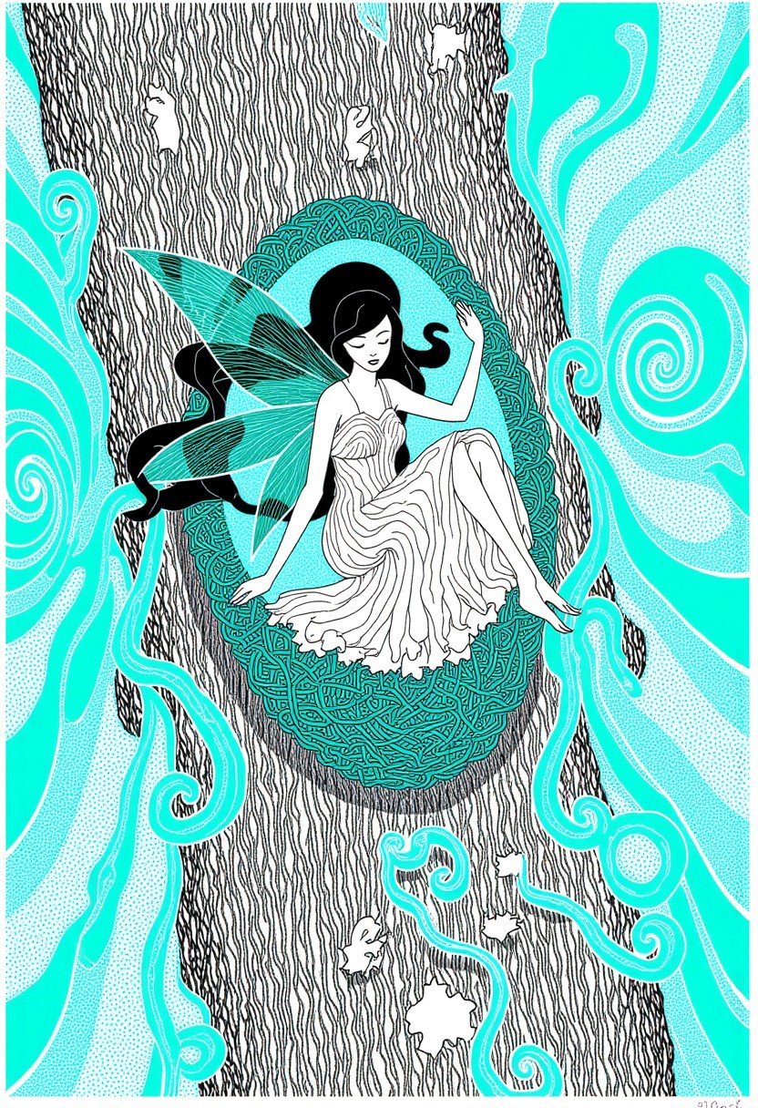 An ethereal gritty graphic illustration in a monochrome turquoise and deep blue palette: A fairy rests gracefully in a nest-like kobel, cradled high within the branches of an ancient tree. The kobel is intricately woven from moss, twigs, and delicate tendrils, forming a harmonious, organic shape. The fairy’s slender, flowing figure is adorned in a gown of delicate, flowing fabric that ripples with intricate Art Nouveau patterns, interlaced with vines and blossoms. Her translucent wings shimmer with subtle turquoise and dark blue tones, curling and extending in elegant, ornamental lines, reminiscent of the natural world’s graceful curves. Her long, dark hair cascades in soft waves, entwined with tendrils and tiny flowers that add to her ethereal appearance. The surrounding branches of the tree curve and twist in elegant, decorative spirals, framed by fluid, sinuous lines that embody the Art Nouveau aesthetic. The air is filled with a soft, swirling mist, subtly glowing with faint turquoise light, giving the scene a dreamlike quality. Monochrome ink illustration, with meticulous, decorative linework, capturing the timeless elegance and mystical atmosphere of Art Nouveau, where nature and the fantastical are seamlessly intertwined. reimagined with a retro 90s CGI aesthetic