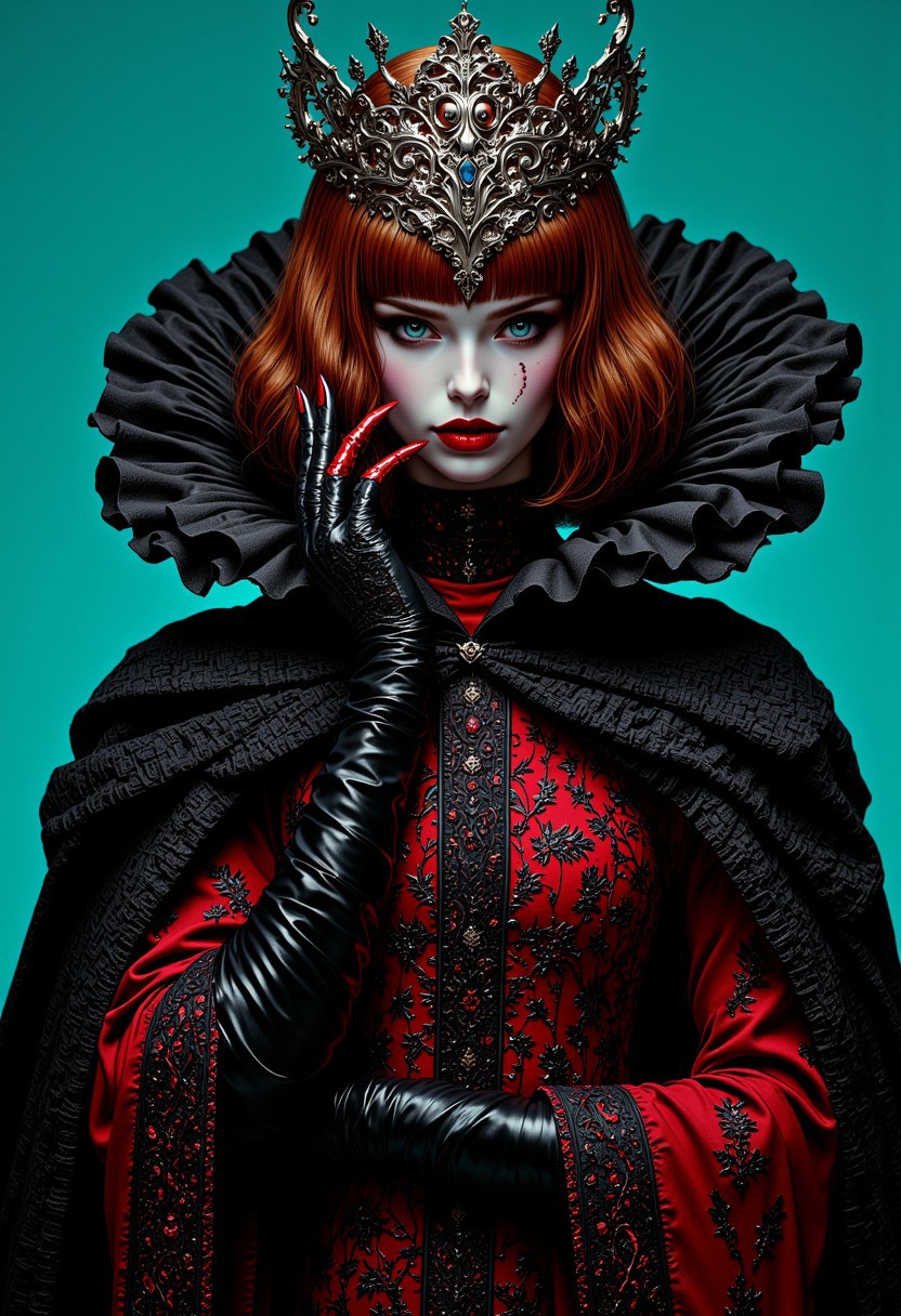 This is a highly detailed digital artwork in a gothic fantasy style, featuring a striking woman with a pale, ethereal complexion and sharp, angular facial features. Her hair is a deep auburn, styled in a bob with bangs, and adorned with a regal, ornate crown. She wears a dramatic, dark, high-collared dress with intricate lace and embroidery, reminiscent of Victorian-era fashion. The dress is now deep crimson with black undertones, accentuated by a vibrant teal background that creates a striking contrast. A chrome masquerade mask with an intricate, reflective surface covers the upper half of her face, enhancing her enigmatic presence. Her hands are adorned with long, sleek black gloves that reach up to her elbows, adding an element of mystery and elegance. The gloves have a polished sheen, suggesting a glossy material. Her expression is intense and captivating, with large, almond-shaped eyes that seem to pierce through the viewer. She is surrounded by a large, ornate, black cape with ruffled edges, adding to the regal and mysterious aura. The overall composition remains dynamic and dramatic, with bold, contrasting colors and intricate details that evoke a sense of opulence and otherworldliness.