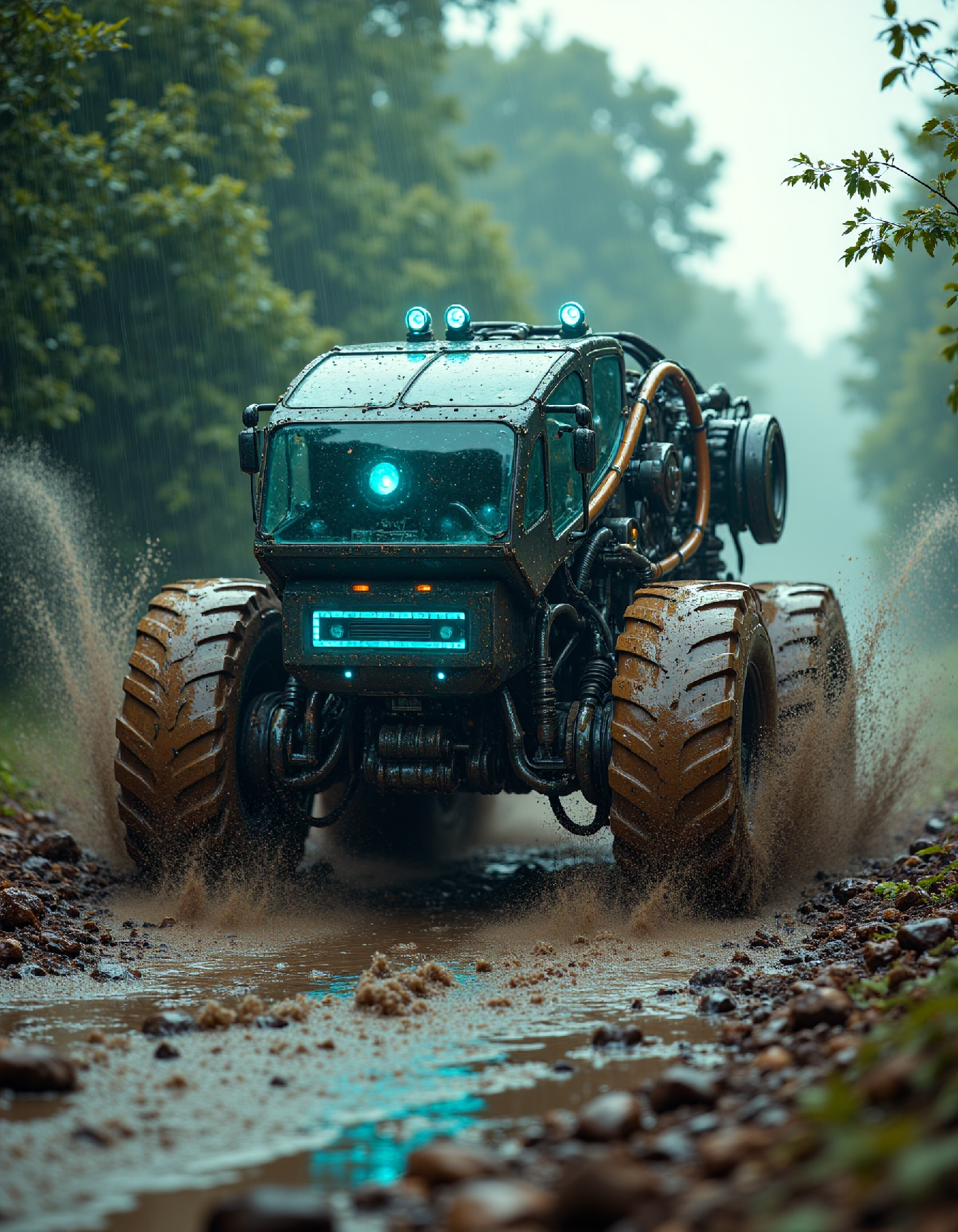 cpstyle01, A massive robotic truck splashes through a muddy terrain, its tires leaving deep impressions in the earth. The vehicle features a futuristic design with glowing blue accents and detailed mechanical components visible under the transparent hood. Water sprays from submerged wheels as it navigates the quagmire, creating a misty effect. Surrounding trees and bushes are partially covered by fogged-down foliage. Nearby, a small stream swells over its banks due to heavy rainfall, adding to the scene's dramatic atmosphere. The scene captures motion and technology in a natural environment.