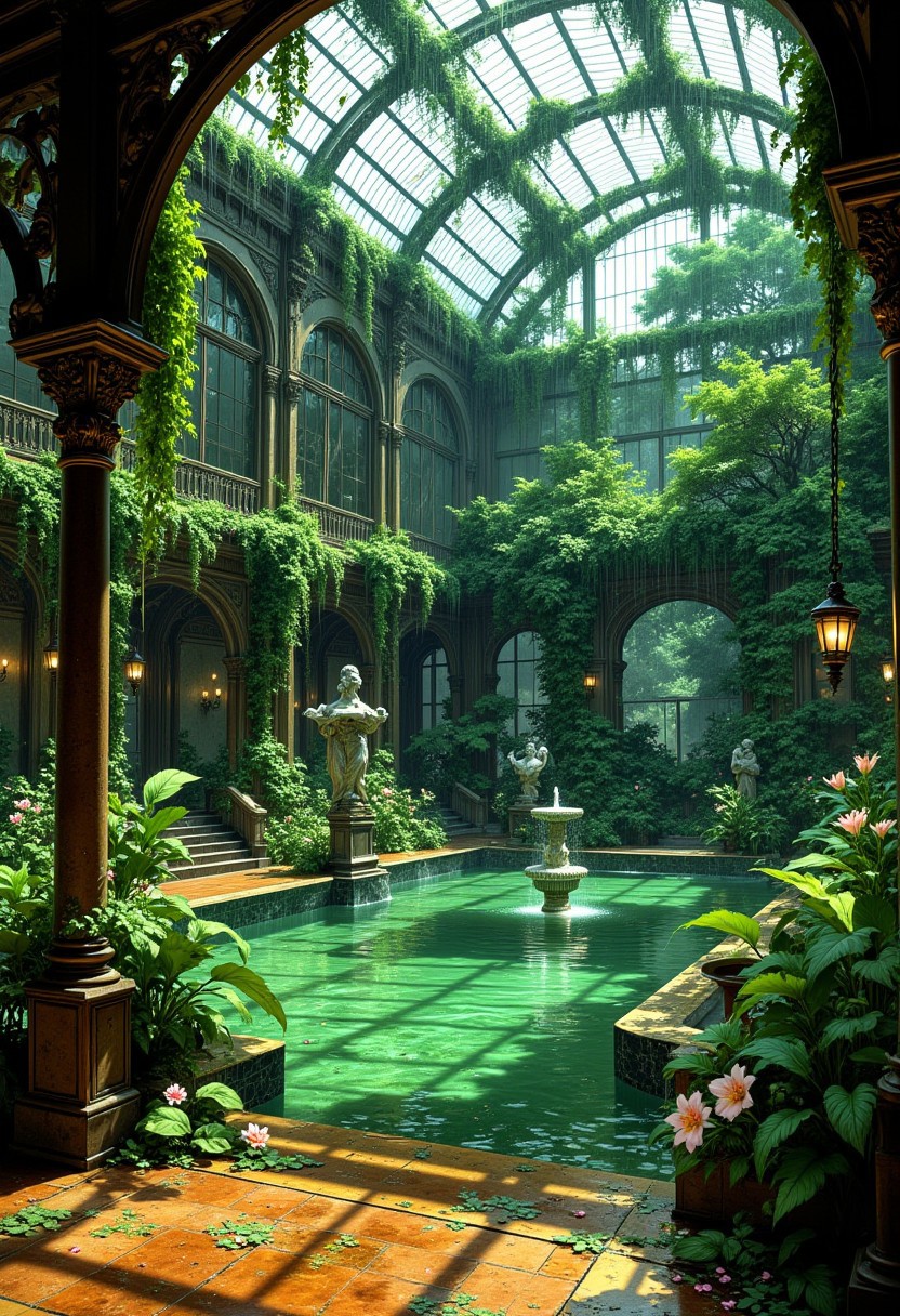 The Verdant Brass Ballroom of Rain-Kissed Time A lush, overgrown ballroom, where the glass-paneled ceiling lets in gentle, misty rain, cascading down the bronze framework in shimmering rivulets. Giant hanging ferns and emerald-green moss drape over antique iron railings, while ivy-covered statues stand half-forgotten amidst whispering mechanical fountains. The floor is worn brass and polished jade, covered in scattered petals and puddles reflecting the soft gaslight glow. The air smells of rain-damp earth, blooming lilies, and warm tea, evoking a sense of quiet serenity and the passage of time in a forgotten oasis.