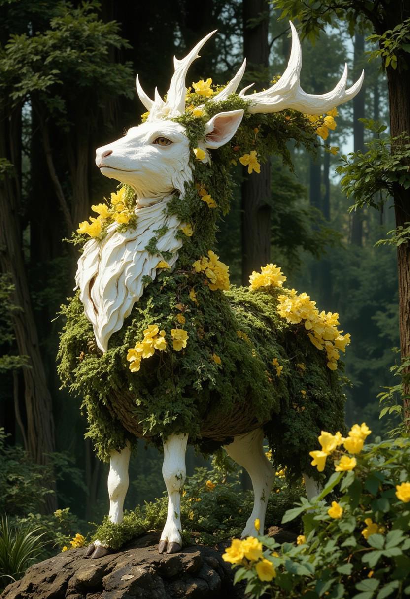 A hyper-realistic Close up shot of a figure completely made of moss and yellow flowers in white deer form, full body zoomed in, ultra sharp focus photo, 3d render, architecture, dark fantasy, vibrant (photography, high-resolution, dynamic, energetic,hyper-realistic, dramatic lighting, shallow depth of field.) Forest background.