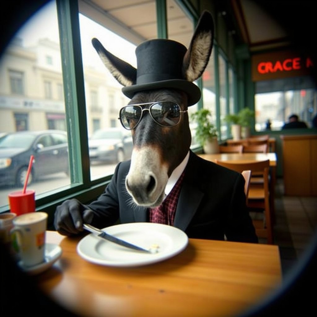 act1vate, Shot with a Holga camera, a donkey dressed in a suit and tie wearing a top hat and sunglasses, sitting in a cafe eating with a knife and fork from a plate that sits on the table infront of it. The photograph taken with a holga camera is a wide angle shot with the donkey and the table in the distance.
