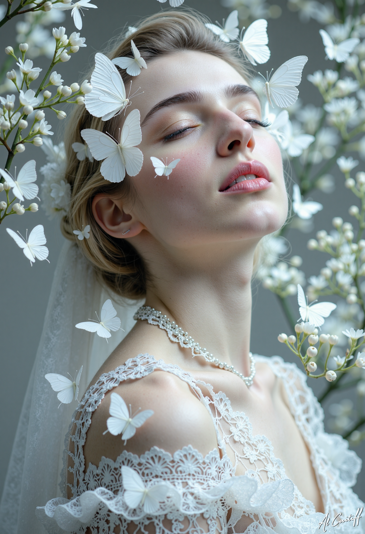 Low-angle shot, 105mm telephoto lens with minimal distortion, no motion blur, deep f/1.4 depth of field. White ethereal scene with monochromatic tones. A woman with pale skin and closed eyes, adorned with intricate white lace and butterfly decorations, wears a delicate white gown. The subject's face is partially obscured by a large white butterfly, while a smaller one rests on her chest. The background is a seamless blend of white flowers and butterflies, creating a dreamlike atmosphere.<lora:CustomFlux/MysticRealism.safetensors:1.0000000000000002:1.0000000000000002>