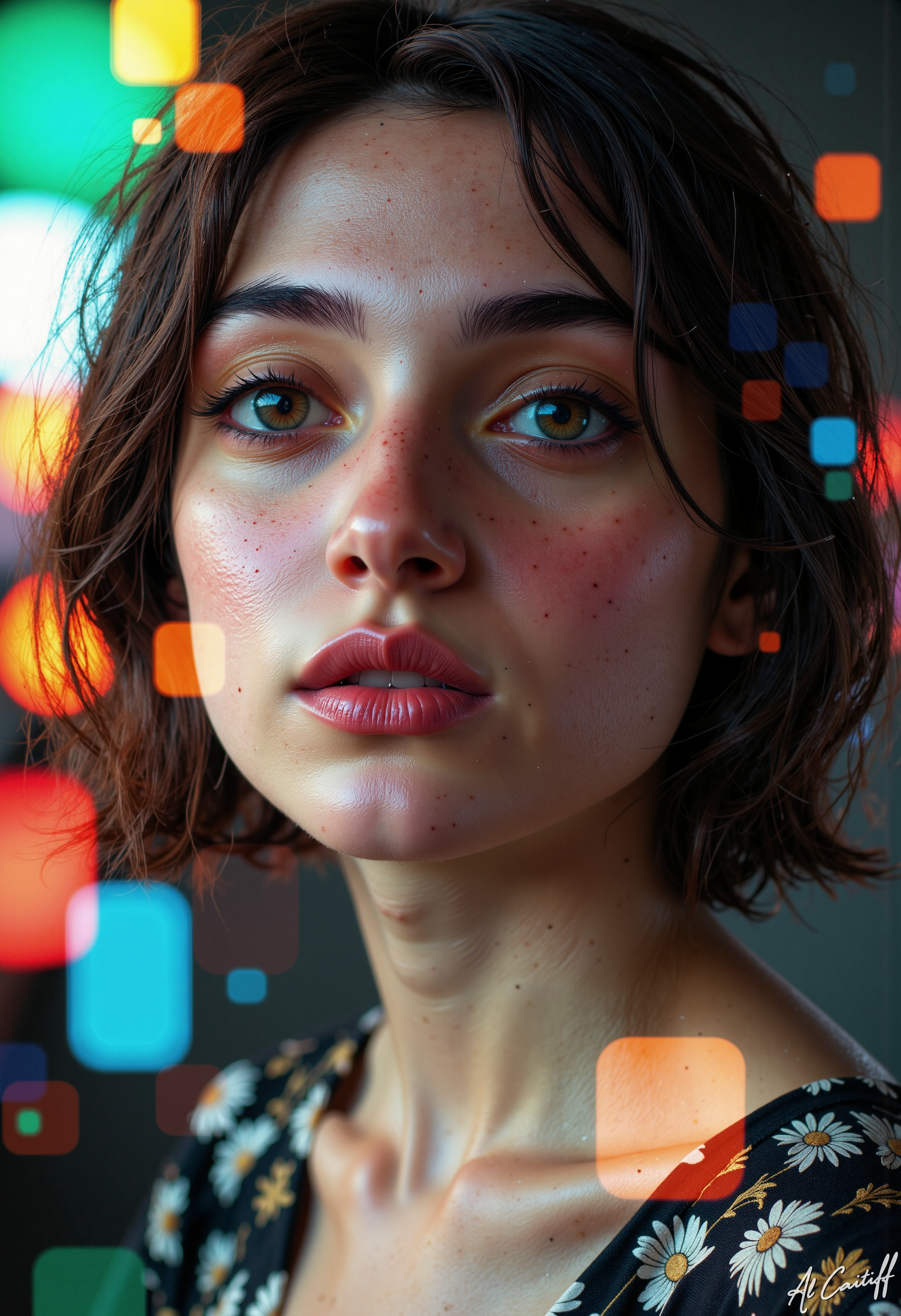High-angle shot, 35mm prime lens with minimal distortion, no motion blur, deep f/1.4 depth of field. Abstract scene with vibrant colors and geometric shapes. A woman with dark hair and a black and white patterned top gazes directly at the camera, her lips slightly parted. The image is overlaid with a collage of colorful squares and rectangles, creating a fragmented and modern aesthetic., CreeepyCuteMagic<lora:Flux/creeepycutemagic-000012 - version ER.safetensors:0.5000000000000001:0.5000000000000001> <lora:CustomFlux/MysticRealism.safetensors:1.0000000000000002:1.0000000000000002>