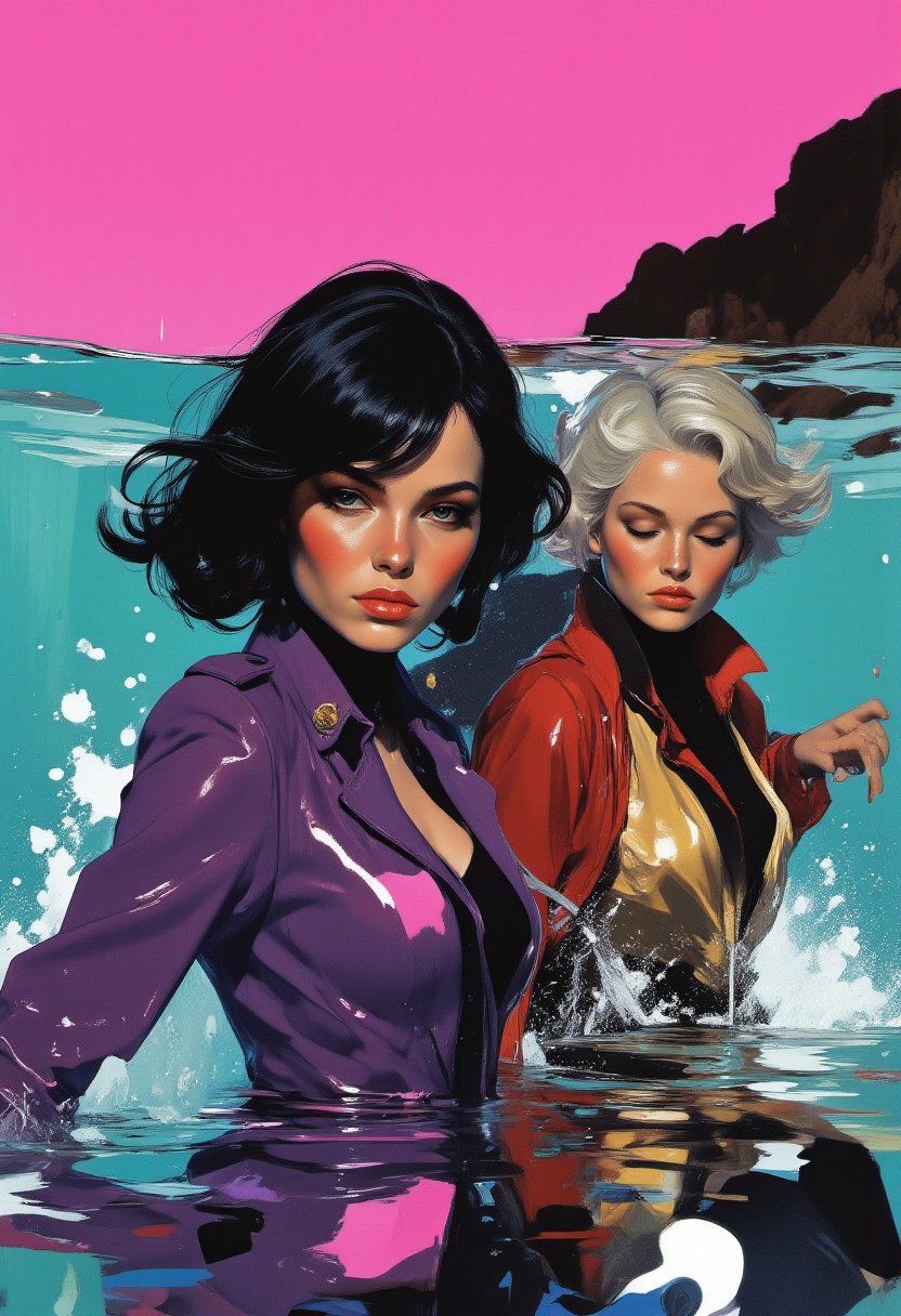 ((highly detailed digital painting:1.3) (inspired by (Nova-70s, Nova-80s, Anime art))) Two women are immersed in water, surrounded by a surreal atmosphere. The background is a vivid, horizontal split of **deep magenta at the top** and **electric cyan at the bottom**, creating a striking contrast. The figures are rendered with hyper-realistic details, emphasizing their expressions and the fluidity of their movements. On the left, a woman with a strong, defined presence and **shoulder-length midnight blue hair** gazes forward with an intense, contemplative expression. She wears a **sleek, metallic violet jacket**, partially submerged, its fabric shimmering with iridescent reflections. Her right arm is extended forward, fingers lightly touching the water’s surface. On the right, another woman with **short, silver-white hair** is captured in motion. She wears a **crimson and gold bomber jacket**, the fabric billowing as if caught in an unseen current. Her eyes are closed, mouth slightly open as if gasping for breath. Her left arm extends backward, mirroring the first woman’s gesture. The water has a **glowing, neon-like quality**, reflecting and distorting the figures. Ripples and suspended bubbles add depth, while streaks of **luminous teal and violet light** dance across the surface, blending hyper-realism with a dreamlike, cyber-surreal aesthetic.