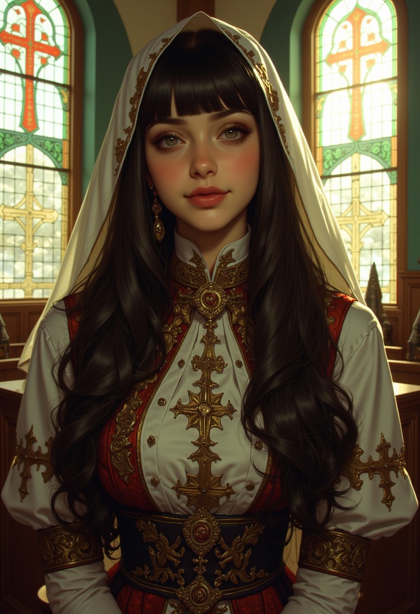 A 38-year-old Russian woman with green eyes and long silky black hair, parted bangs, hair framing face, high cheekbones, small commissures wrinkles, smile, parted lips, very large breasts, dressed in a russian folkloric attire, veil. Indoors, orthodox chapel, (stained glass windows:1.5), (volumetric lightning:1.4), sunrays entering through windows.