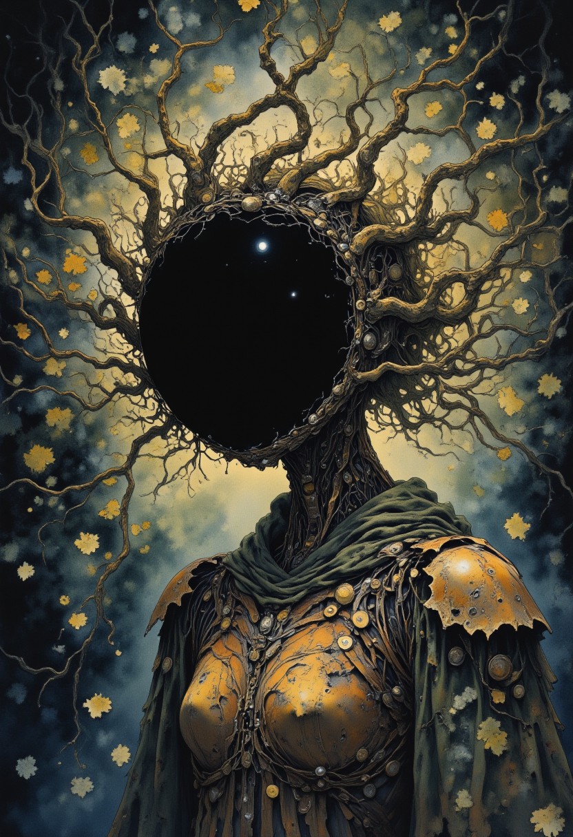 Studio Ghibli Dark Fairytale, intricate cyborg, Portrait of a female robotic entity with long, flowing hair made of twisted, gnarled branches, black hollow eerie head, no face, dark moody, eerie forest background, autumnal decay, golden leaves floating in the air, gothic steampunk influences, organic-mechanical fusion, glowing runes embedded in her wooden frame, delicate but unsettling presence, oil painting textures, cinematic lighting, deep shadows, warm but melancholic glow, mystery and sorrow intertwined