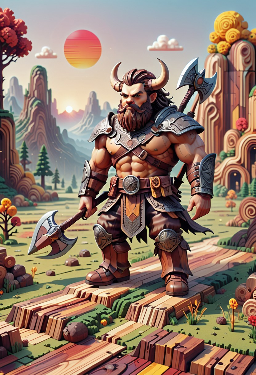 (((everything made out of wood, a cute chibi warrior))), masterpiece, best quality, good quality, newest, highres, absurdres,focused subject,8k,HDR, A muscular Valkyrie style Norse warrior riding a fantastical huge white beast in a rugged, mountainous landscape. The man, with a rugged, bearded face and long, dark hair, is dressed in medieval-style attire consisting of a sleeveless brown leather vest, brown trousers, and brown boots. He wears a belt with a sheathed sword and a quiver of arrows. He also has weapons/axe/hammer. His expression is determined as he rides the beast. The ground beneath them is rocky and uneven, with patches of grass and sparse vegetation. big sun, sunset, dramatic lighting, mainly red, orange and yellow colors, yellow sphere on the background, (glitch art, dithering,chromatic aberration,pixel art, film grain),dynamic angle,perspective, scenery,fine art,in the style of cknc,wat,flatline, (hardwood Wonderland, Transform the universe into a beautifully carved realm of wood, funny, haha)