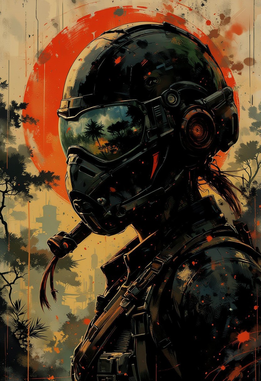 in the style of ck-mgs, nistyle, A dinkfsn style ink wash painting, on rice paper, sepia, henna , Silhouette Art, magnificent, closeup portrait of stunning japanese female sc-fi soldier, helmet, mirrored visor reflecting jungle environment