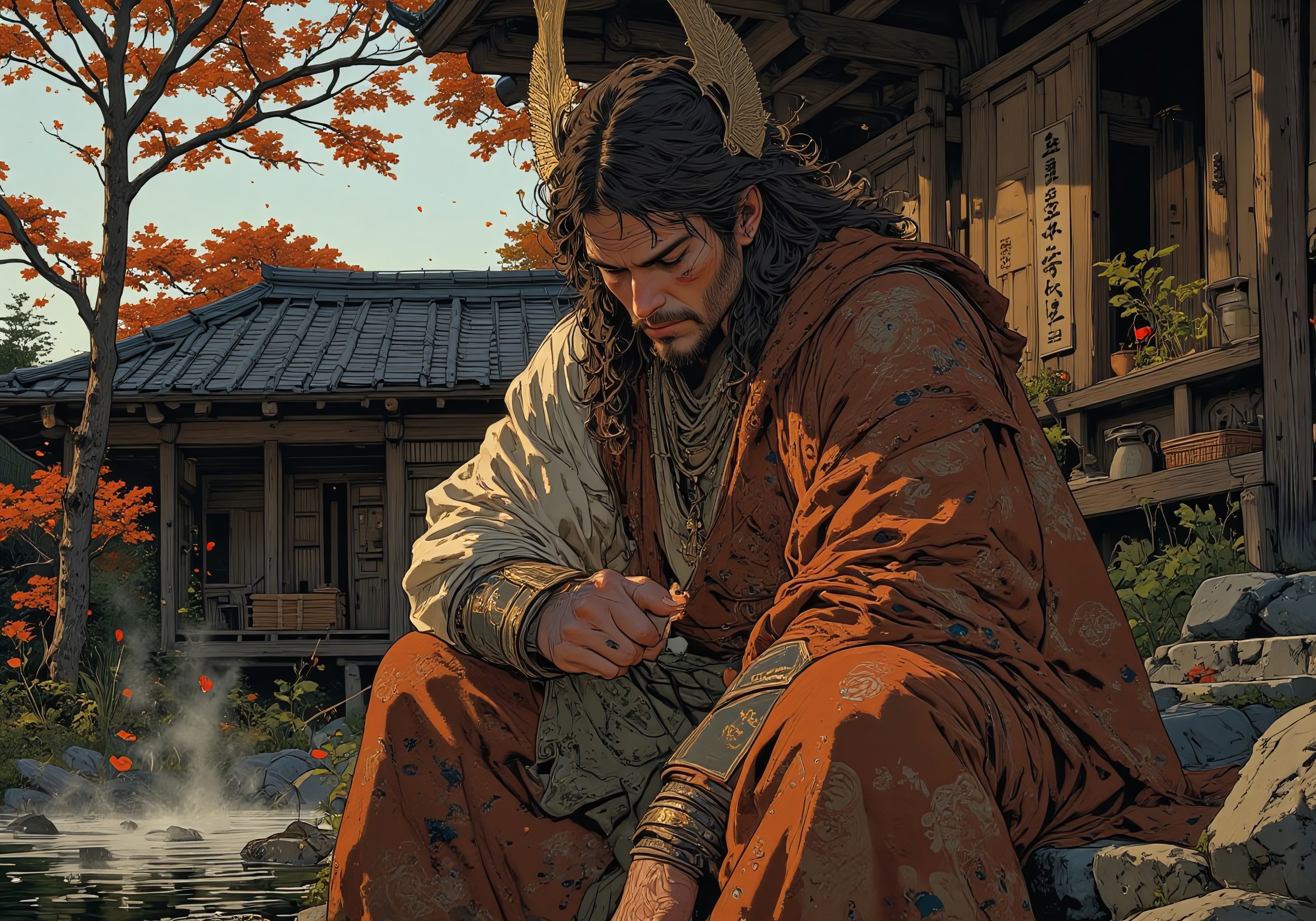 ((samurai dressed for battle in full armor)), solo focus, (sitting on steps in a serene Japanese garden), ((pond with bamboo wooden feature)), ((cherry blossom tree with petals falling)), ((sunrise casting warm light)), (traditional Japanese house in the background), (peaceful yet resolute expression), detailed samurai armor, red white and gold armor, (soft morning mist:1.5), (gentle ripples in the pond), (bamboo and stone elements), (traditional aesthetics), (wind-blown cherry blossoms), (chiaroscuro lighting), (cinematic composition), sunrise, clear blue sky with red hues, f4nt4st1c