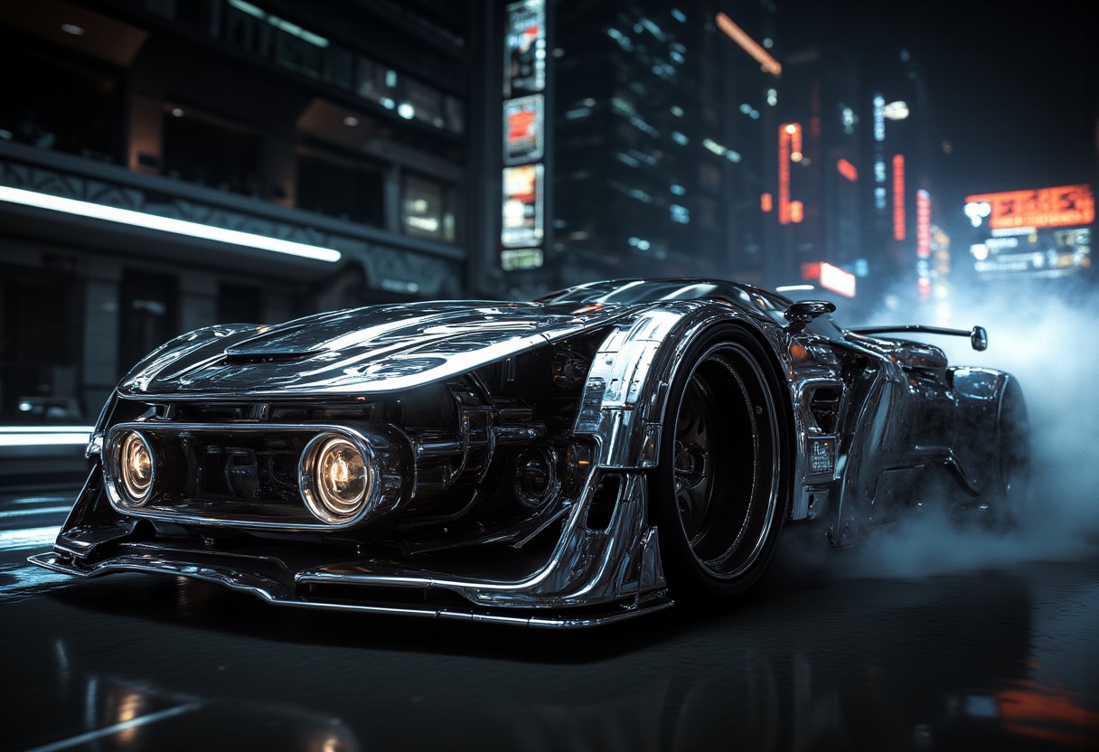 yper realistic,metal,professional photo of a futuristic muscle car with multiple modifications, large wheels, driving, cybernetic hood, cyber car parts, front pop up headlights, science fiction, sci-fi scenario, (night), natural light, cyberpunk, futuristic city, cyberpunk city, neon signs, highly detailed, (highly detailed background), multiple buildings in the background, detailed textures, wide angle, 8k, HDR, professional photoshoot, high quality photo, realistic photo, realistic shadows, detailed shadows, realistic proportions,film grain, raw photo,(front)