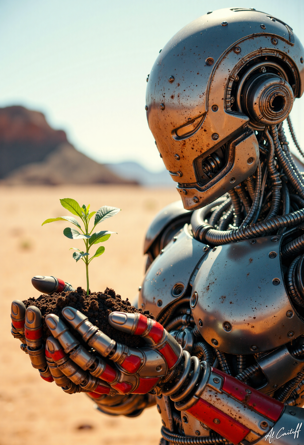 Low-angle shot, 35mm prime lens with minimal distortion, no motion blur, deep f/1.4 depth of field. Desert scene with harsh sunlight. A cyborg with metallic silver and rusted red armor, featuring intricate mechanical joints, holds a small green sprout in its gloved hands. The cyborg's visor reflects the harsh light, obscuring its eyes. The background is a blurred desert landscape with a distant mountain. The cyborg's hands, with their intricate mechanical fingers, cradle the soil and sprout, symbolizing a connection to nature amidst a barren environment.<lora:CustomFlux/MysticRealism.safetensors:1.0000000000000002:1.0000000000000002>