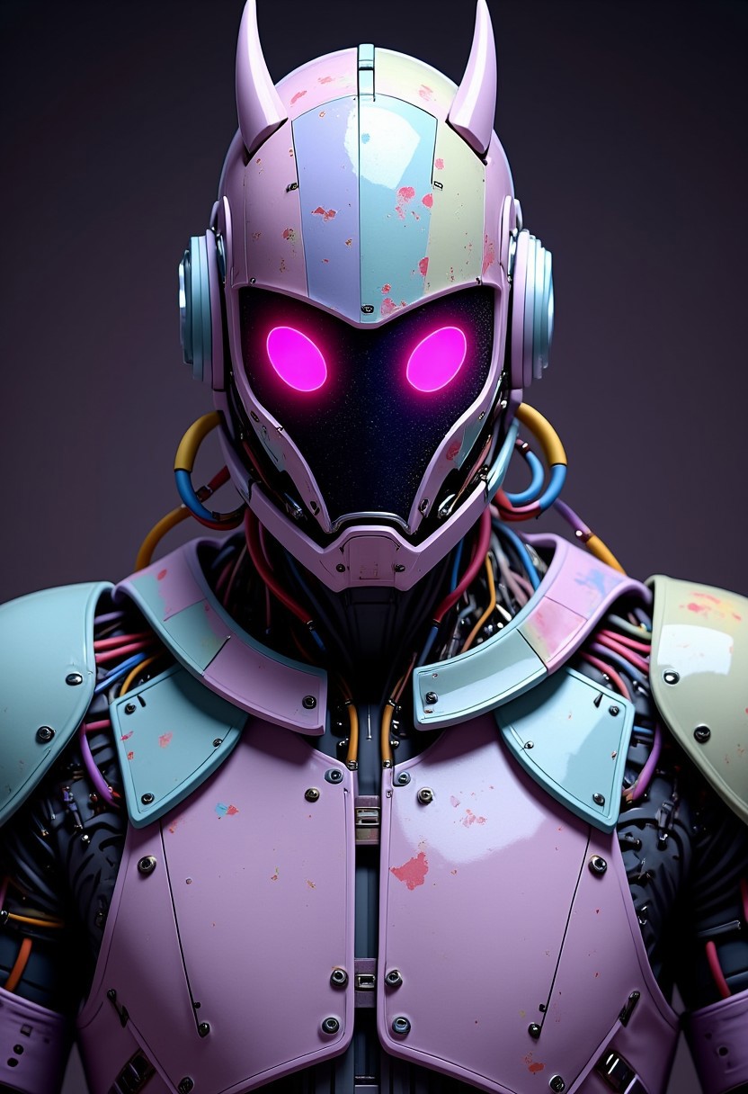 ajpasbot.The image is a highly detailed, dark CGI artwork featuring a futuristic sinister, medieval knight with Dragon exoskele Armor. Atmospheric lighting, The knight is clad in a battle-worn suit of armor, forged from vibrant pastel steel with jagged, sharp edges that reflect no light. The helmet, a menacing piece of craftsmanship, completely covers the face, with a darkened visor glowing with a pastel neon light, as if it were a demonic eye staring from within. The visor is adorned with Red, blue, Yellow, crimson and violet markings, worn by years of battle, and radiates an unsettling, ominous glow. The knight’s armor is a darker pastel, weathered metallic alloy, with the once polished surface now scarred, chipped, and stained with pastel scratches from countless battles. The chest plate is intricately designed with cruel spikes and angular edges, giving it a brutal, threatening appearance. The shoulder pads are large and imposing, with dark, twisted designs etched into the metal.