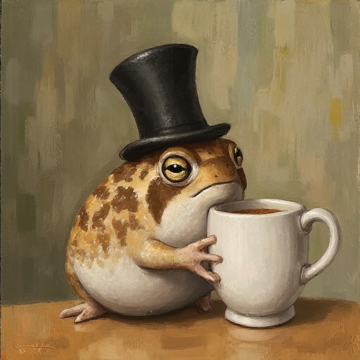Oil painting featuring P0tat0-ree, Desert rain frog, wearing a top hat, drinking a tea from a cup