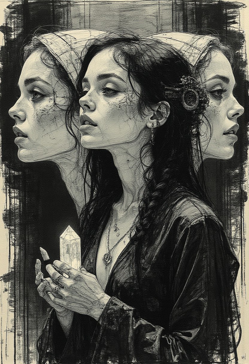 (highly detailed, charcoal, graphite, ink, surreal monochrome, pointillism, gothic style, Elden Ring style, dark atmosphere, Sydme1 painting, ArsMJStyle, Ethereal Gothic) A woman with a pale, skeletal face, hollow eyes, and a faint spectral glow encircling her like a phantom halo. Her jet-black hair, rendered in fine strokes, cascades in intricate braids. She wears a flowing, ink-stained robe with silver-threaded patterns. Her elongated sleeves drape like veils, while filigree accents etched in graphite enhance her ghostly elegance. A dark metal chain with an obsidian crescent moon rests against her throat. Her slender hands—marked by silver rings and metallic tattoos—cradle a glowing crystal, its radiance piercing the darkness like shattered moonlight. The background is a dreamscape of stark contrasts and shifting illusions. Vertical bands of black and spectral gray stretch like distorted cathedral pillars. Two fragmented human faces, composed of pointillist strokes, emerge—one left, one right—warping and dissolving into the surrounding ink. The composition pulses with surreal movement, evoking optical illusion depth. Rich textures blend smudged charcoal shadows with razor-sharp ink lines. Silver highlights and crystalline patterns punctuate the darkness, lending an unearthly luminescence. Haunting yet mesmerizing, the artwork fuses the sacred and the macabre, creating a vision both enigmatic and divine.