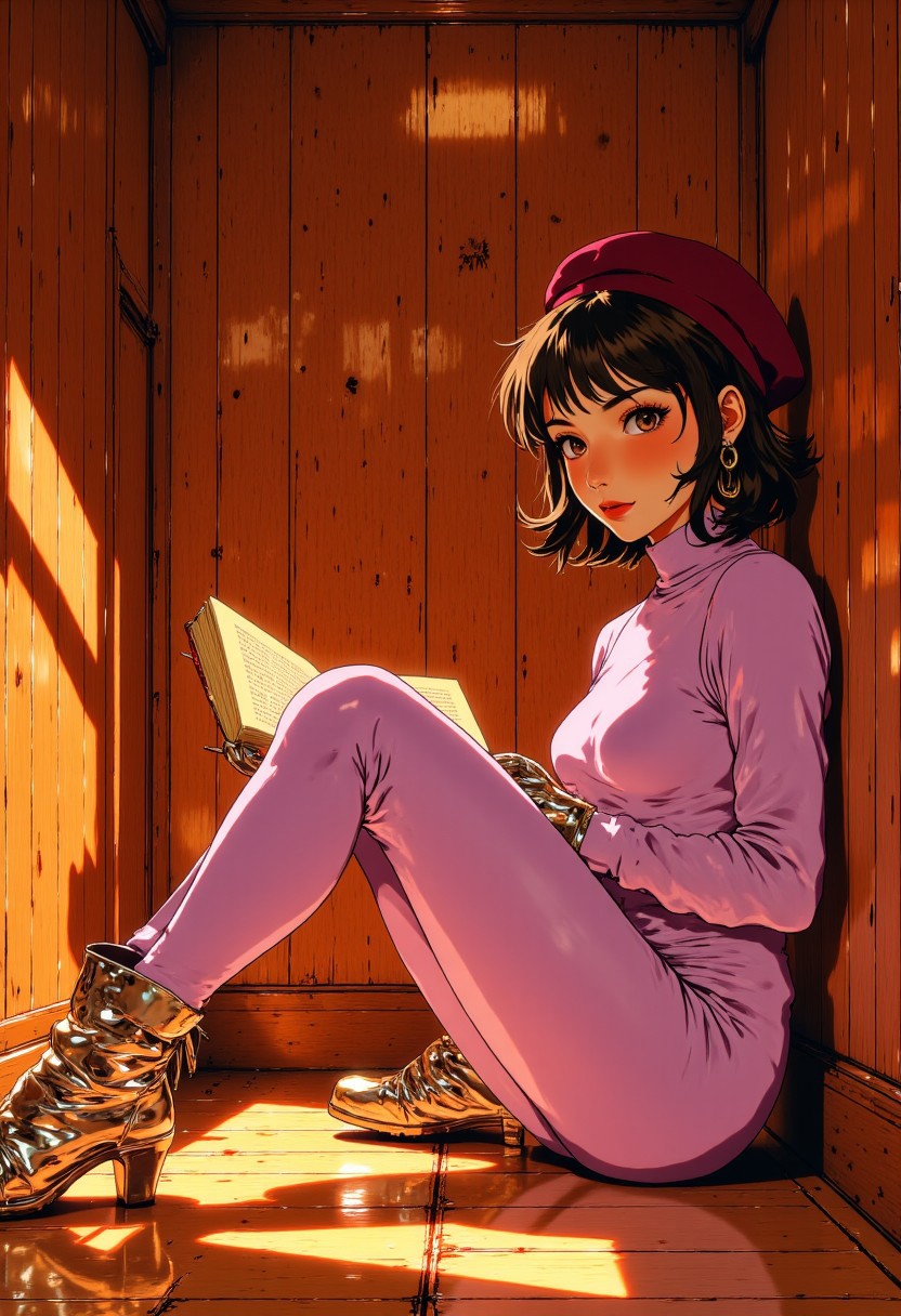A young woman sits on the ground in a warm, intimate wooden chamber, her form elegantly positioned against the richly grained wooden wall. The space feels enclosed and personal, with soft amber light filtering through unseen gaps, casting a gentle warmth across the scene. She's wearing a lavender pink one-piece full body tight leotard with pink lavender tight leggings, creating a sleek silhouette against the rustic wooden background. A soft, slightly oversized beret in a deep burgundy rests slightly askew on her head, partially covering her forehead and adding a touch of artistic elegance to her ensemble. Her legs are bent, serving as a perfect resting place for an open novel. The book's pages are slightly yellowed, suggesting a well-loved volume. Her shiny, metallic silver boots and matching gloves catch the warm light, both knee raised, creating subtle reflections that contrast beautifully with the muted wooden tones of the chamber. Her metallic silver gloves shown holding the book. When she turns her head to meet the viewer's gaze, her expression is contemplative yet welcoming - a mix of concentration and quiet invitation. The wooden chamber feels lived-in and comfortable, with subtle textures of polished wood panels, a soft patina of age, and an almost tangible sense of peaceful solitude. Soft shadows play across the surfaces, creating depth and enhancing the intimate, comforting atmosphere.