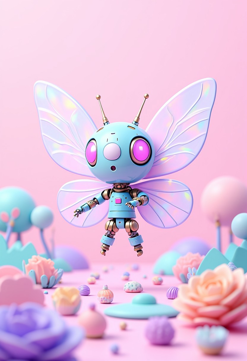 ajpasbot. This is a whimsical, CGI-rendered digital artwork featuring a fantastical, insectoid robot butterfly. The creature has a metallic, futuristic body with a soft, iridescent blue hue. Its wings are large and delicate, composed of semi-transparent, pastel-hued membranes that shimmer with shades of pink, purple, and blue, giving them a dreamy, almost ethereal quality. The robot's body is segmented, with a slender, segmented abdomen that transitions into a tail, ending in a small, rounded tip. Its antennae are slender, extending upwards from its head, which features large, round, glowing purple eyes. The robot's body is adorned with small, golden mechanical parts and a small, circular sensor on its thorax. The background is a soft, gradient pink sky that transitions from a pale pink at the top to a deeper, more vibrant pink at the bottom. The ground is a lush, fantastical landscape filled with various, oversized, colorful flowers and plants.