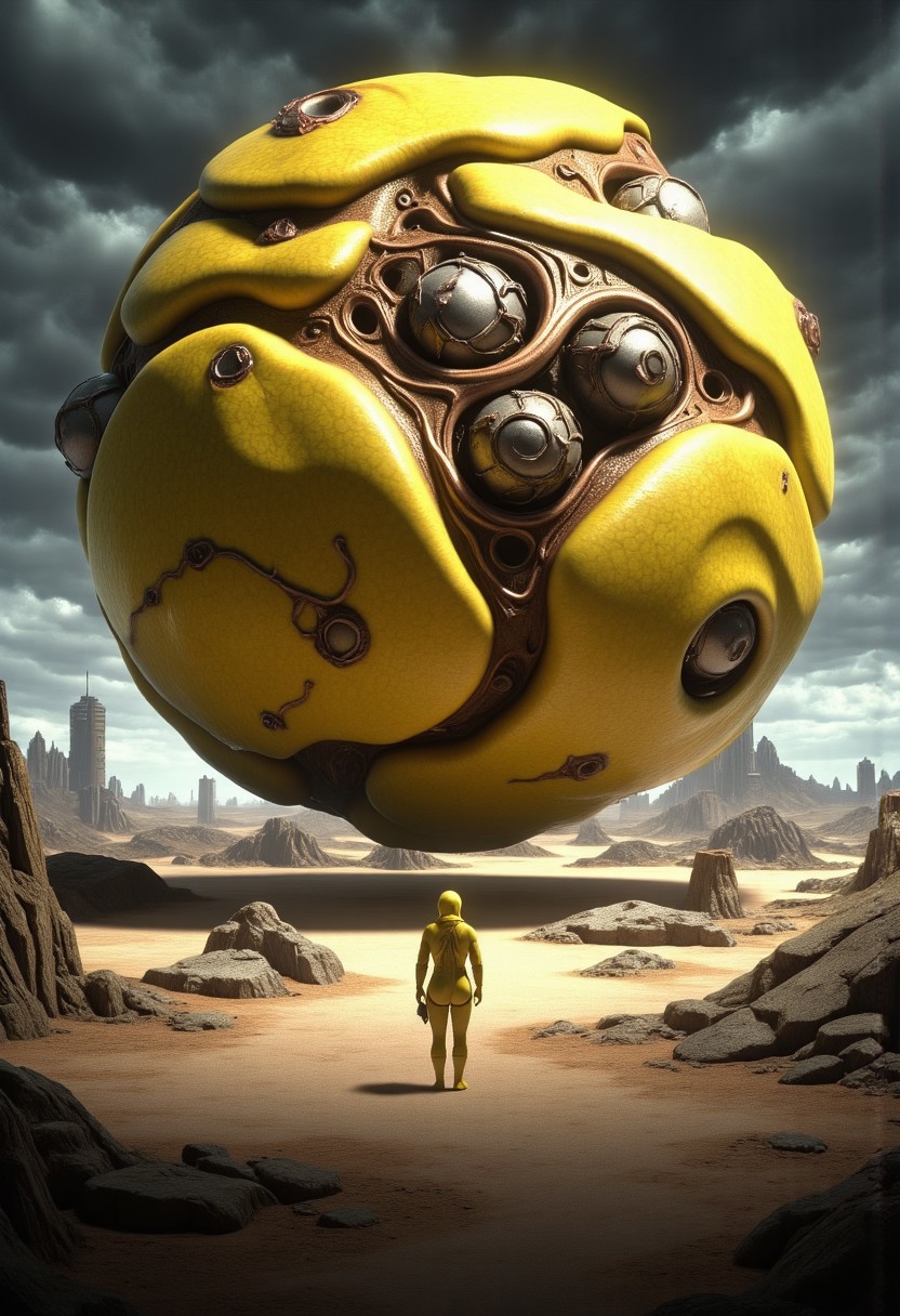 A hyper-realistic hauntingly beautiful dark sci-fi scene featuring a vast, barren landscape with a colossal, organic, yellow spherical object. A sphere made up of intertwined and fused egg spheres, intertwined veins and layered flesh reveals a structure of fused mutated spheres and intertwined veins and sinews. A woman in a yellow biohazard suit stands on rocky terrain, staring at the mysterious sphere. An overcast sky hangs over her, creating an eerie atmosphere on the desert landscape. In the distance, man-made structures can be seen on the horizon, hinting at a wider world, sci-fi and high tech. This striking image evokes a sense of wonder and curiosity, inviting viewers to explore the mysterious world that lies within, cinematic, painting, high definition, high detail, 16K resolution. ultra sharp focus photo, 3d render, architecture, dark fantasy, vibrant (photography, high-resolution, dynamic, energetic,hyper-realistic, dramatic lighting, shallow depth of field.). masterpiece, 32k, ultra HD, ultra-detailed, amazing quality, amazing artist, sharp edges, detailed textures, full view, atmospheric lighting, amazing visuals